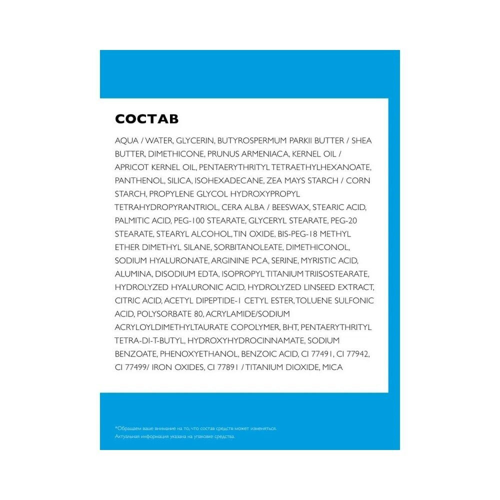| Состав | aqua / water, glycerin, butyrospermum parkii butter / shea butter, dimethicone, prunus armeniaca kernel oil / apricot kernel oil, pentaerythrityl tetraethylhexanoate, panthenol, silica, isohexadecane, zea mays starch / corn starch, propylene glycol hydroxypropyl tetrahydropyrantriol, cera alba / beeswax, stearic acid, palmitic acid, peg-100 stearate, glyceryl stearate, peg-20 stearate, stearyl alcohol, tin oxide, bis-peg-18 methyl ether dimethyl silane, sorbitanoleate, dimethiconol, sodium hyaluronate, arginine pca, serine, myristic acid, alumina, disodium edta, isopropyl titanium triisostearate, hydrolyzed hyaluronic acid, hydrolyzed linseed extract, citric acid, acetyl dipeptide-1 cetyl ester, toluene sulfonic acid, polysorbate 80, acrylamide/sodium acryloyldimethyltaurate copolymer, bht, pentaerythrityl tetra-di-t-butyl hydroxyhydrocinnamate, sodium benzoate, phenoxyethanol, benzoic acid |