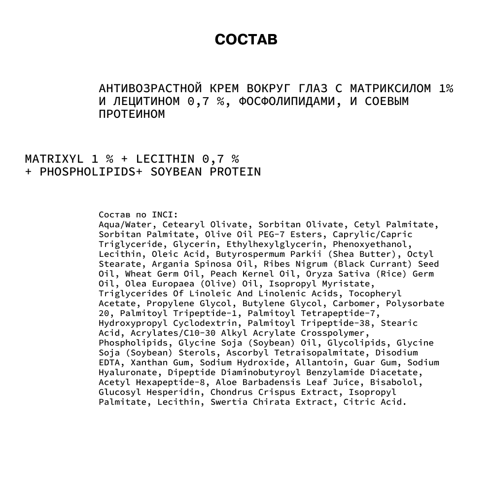 | Способ применения | Нанести на чистую, протонизированную кожу вокруг глаз. При выходе на активное солнце использовать крем с SPF-защитой. Использовать каждый день в вечернем уходе. Рекомендованный курс от 6 месяцев. |