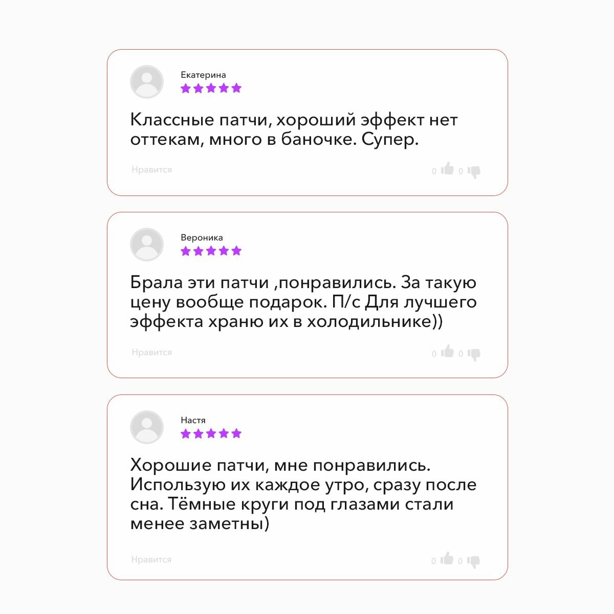 | Способ применения | для охлаждающего эффекта патчи лучше положить в холодильник перед использованием. Лопаточкой достать патчи из контейнера, разместить на очищенной коже под глазами острым кончиком к переносице, добиться плотного прилегания, держать 15-30 минут, затем патчи аккуратно удалить, остатки средства мягко втереть в кожу, не смывая. Рекомендованный курс – 30 дней. Патчи можно использовать и на других участках лица |
