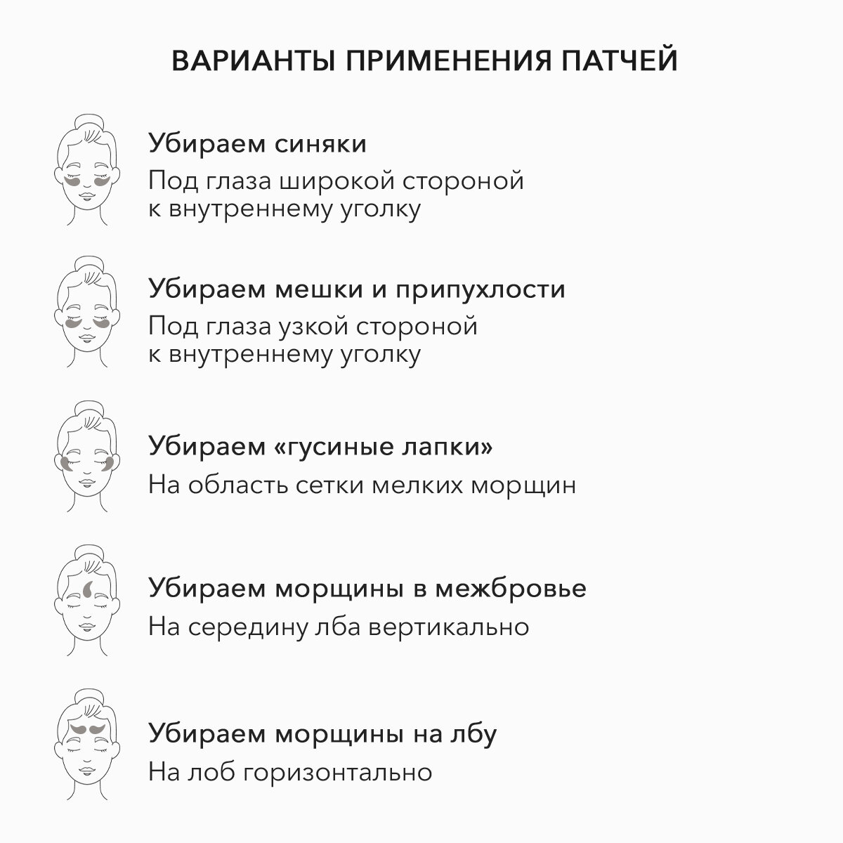| Способ применения | для охлаждающего эффекта патчи лучше положить в холодильник перед использованием. Лопаточкой достать патчи из контейнера, разместить на очищенной коже под глазами острым кончиком к переносице, добиться плотного прилегания, держать 15-30 минут, затем патчи аккуратно удалить, остатки средства мягко втереть в кожу, не смывая. Рекомендованный курс – 30 дней. Патчи можно использовать и на других участках лица |