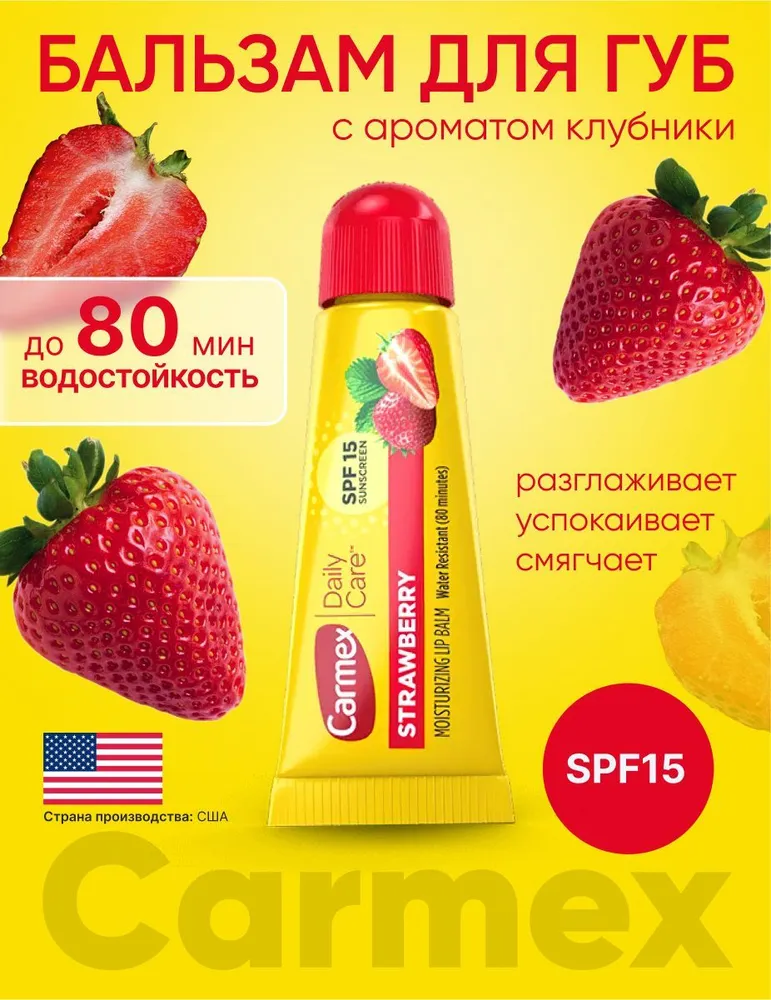 Бальзам для губ Carmex с ароматом клубники увлажняющий, восстанавливающий, SPF 15, туба в блистере, США