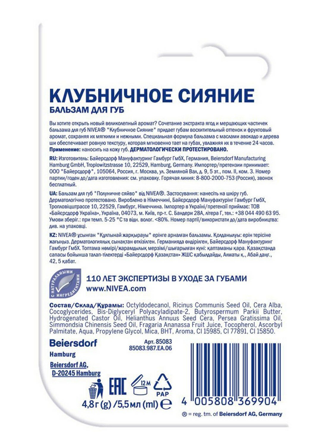 NIVEA Бальзам для губ Клубничное сияние, 4,8 гр