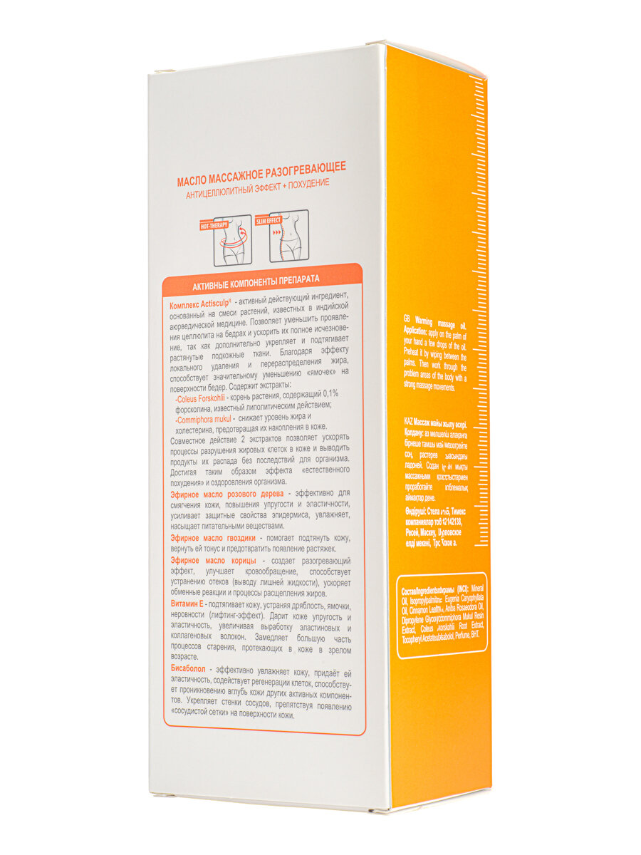 | Способ применения | нанесите на ладони, прогрейте масло, затем массажными движениями проработайте проблемные участки тела |