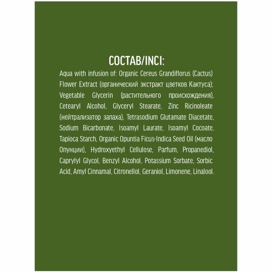 | Полный состав | Aqua with infusion of: Organic Cereus Grandiflorus (Cactus) Flower Extract (органический экстракт цветков Кактуса); Vegetable Glycerin (растительного происхождения), Cetearyl Alcohol, Glyceryl Stearate, Zinc Ricinoleate (нейтрализатор запаха), Tetrasodium Glutamate Diacetate, Sodium Bicarbonate, Isoamyl Laurate, Isoamyl Cocoate, Tapioca Starch, Organic Opuntia Ficus-Indica Seed Oil (масло Опунции), Hydroxyethyl Cellulose, Parfum, Propanediol, Caprylyl Glycol, Benzyl Alcohol, Potassium Sorbate, Sorbic Acid, Amyl Cinnamal, Citronellol, Geraniol, Limonene, Linalool. |