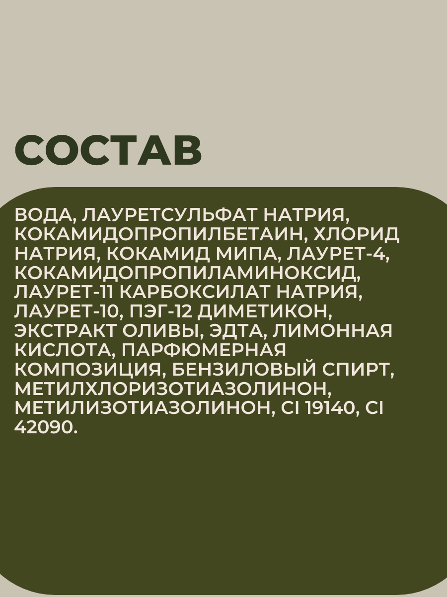 | Состав | Вода, лауретсульфат натрия, кокамидопропилбетаин, хлорид натрия, кокамид МИПА, лаурет-4, кокамидопропиламиноксид, лаурет-11 карбоксилат натрия, лаурет-10, ПЭГ-12 диметикон, экстракт оливы, ЭДТА, лимонная кислота, парфюмерная композиция, бензиловый спирт, метилхлоризотиазолинон, метилизотиазолинон, CI 19140, CI 42090. |
