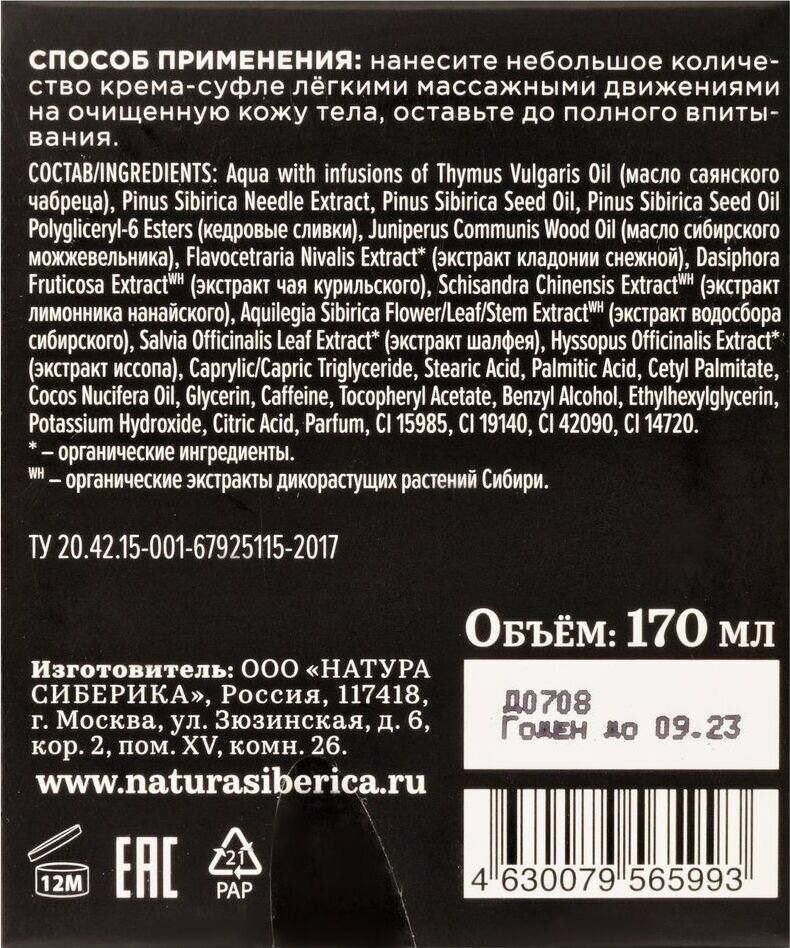 | Состав | Aqua with infusions of Moose Milk (лосиное молоко), Spiraea Ulmaria ExtractWH (экстракт таволги сибирской), Achillea Asiatica Flower/Leaf/Stem EctractWH (экстракт тысячелистника азиатского), Scutellaria Baicalensis Root ExtractWH (экстракт шлемника байкальского), Schisandra Chinensis Fruit ExtractWH (экстракт лимонника нанайского), Butyrospermum Parkii Butter, Cocos Nucifera Oil, Pinus Sibirica Seed Oil (взбитое кедровое масло), Oenothera Biennis Oil* (масло примулы вечерней), Cetearyl Alcohol, Linum Usitatissimum Seed Oil* (льняное масло), Triticum Vulgare Germ Oil* (масло зародышей пшеницы), Glycerin, Glyceryl Stearate, Tocopherol (витамин Е), Hippophae Rhanmoides Fruit Oil* (масло облепихи), Xanthan Gum, Sodium Stearoyl Glutamate, Parfum, Citric Acid, Benzyl Alcohol, Ethylhexylglycerin.*– Органические ингредиенты.WH – Органические экстракты дикорастущих растений Сибири. |