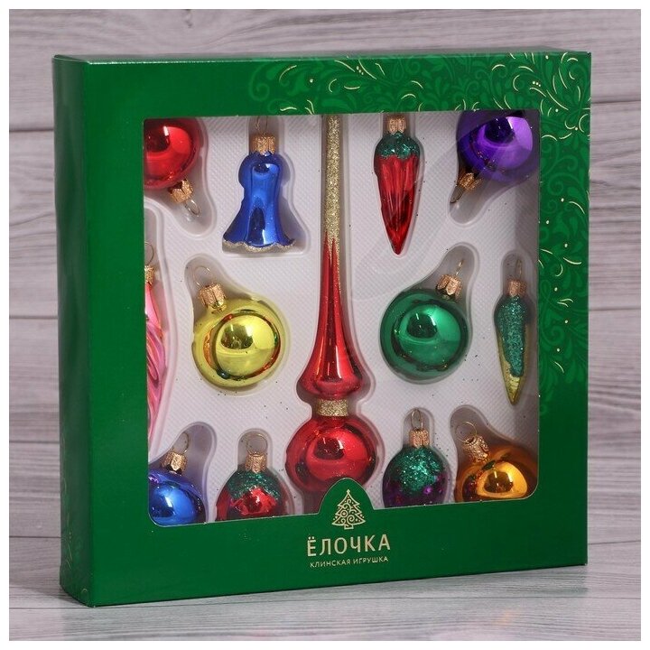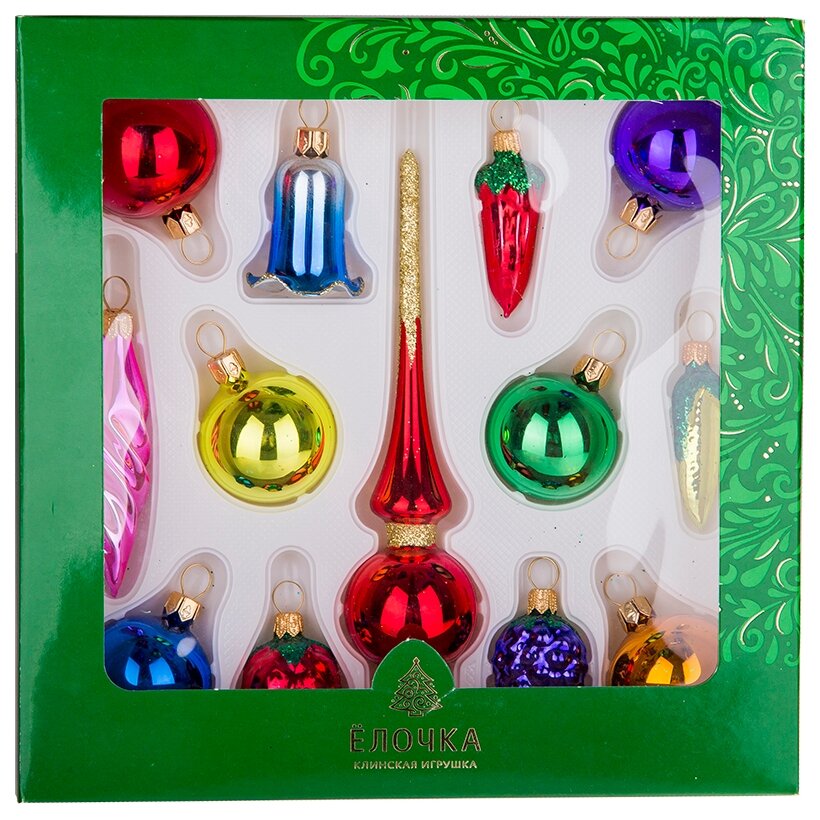 | Комплектация | елочные шары - 6 шт., фигурки-ягоды - 2 шт., фигурка-перчик, фигурка-кукуруза, сосулька, колокольчик, наконечник на ёлку |