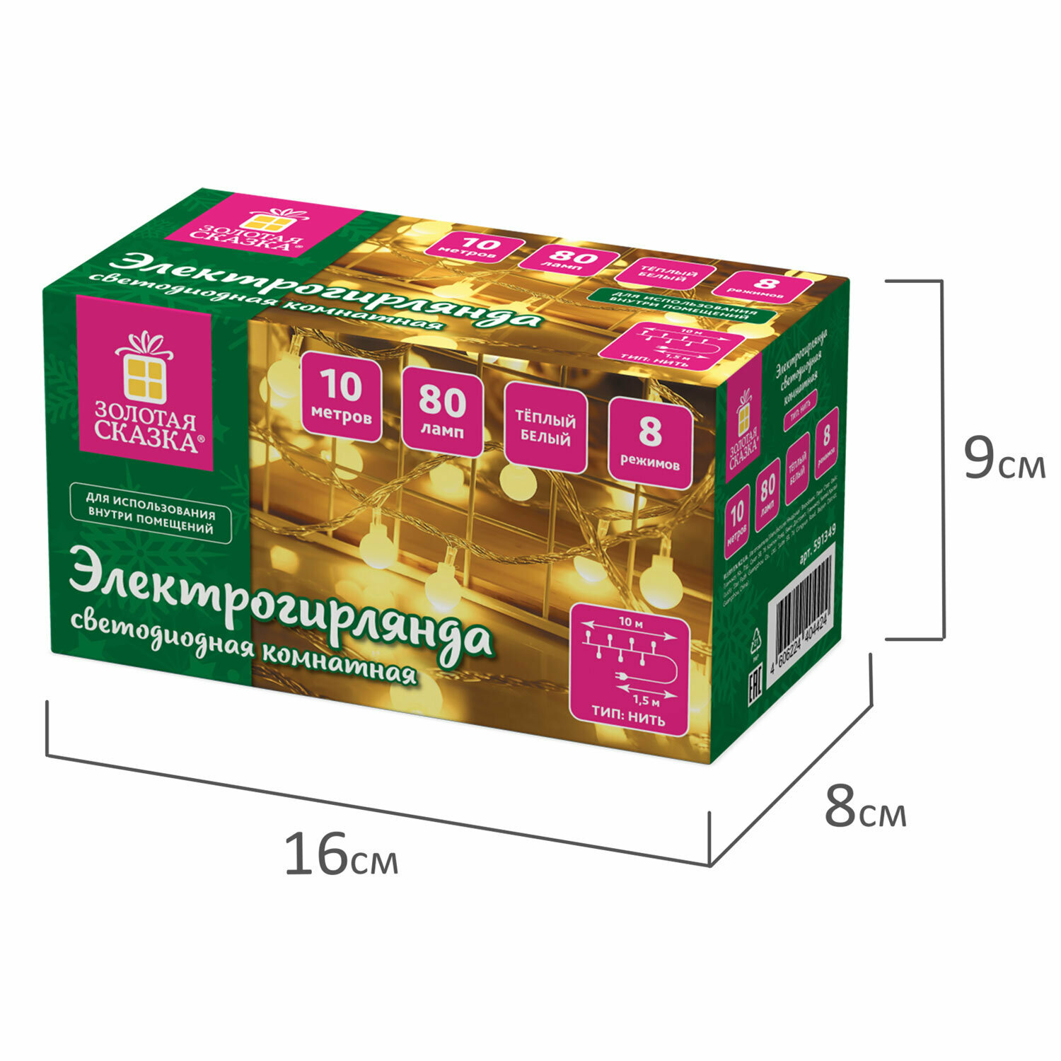 Электрогирлянда-нить комнатная "Шарики" 10 м, 80 LED, теплый белый свет, 220 V, контроллер, золотая сказка, 591349