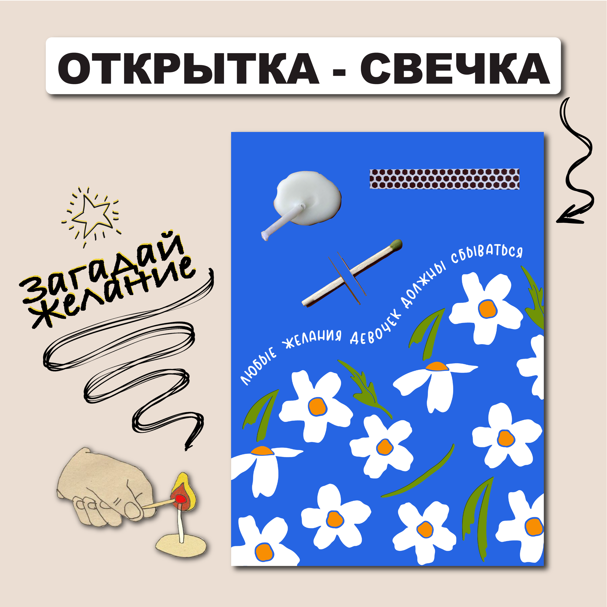 Открытка свечка "Загадай", от Вьюнчик, 14,8х10,5 см (А6), стильная поздравительная открытка на день рождения