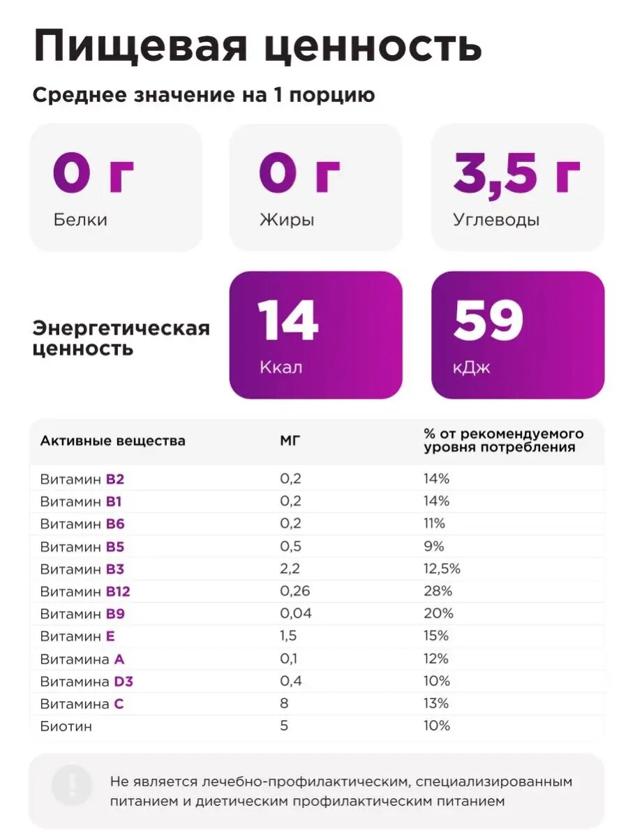| Состав | екстроза; лимонная кислота; таурин; порошок красных арктических водорослей Lithothamnion sp; комплекс витаминов С, Е, А, Д3, Н, В1, В2, В3, В5, В6, В9, В12; лактоза; сукралоза; ароматизатор пищевой; кармин |