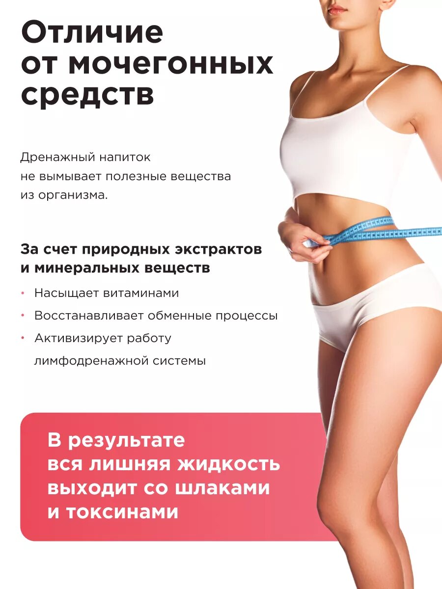 | Дополнительная информация | Для достижения эффективного результата, рекомендуется пропить курс, который составляет от 3-4 недель. В этот период важно поддерживать водный баланс и пить в среднем от 3-4 л воды в сутки. Как только вы восстановите нормальный питьевой режим, организм начнет выводить воду из подкожной жировой клетчатки. |