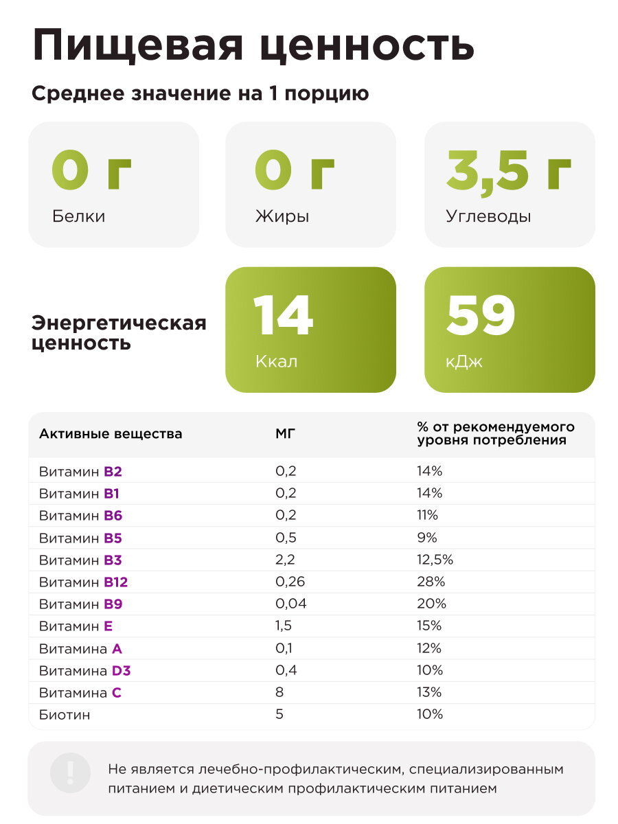 | Состав | екстроза; лимонная кислота; таурин; порошок красных арктических водорослей Lithothamnion sp; комплекс витаминов С, Е, А, Д3, Н, В1, В2, В3, В5, В6, В9, В12; лактоза; сукралоза; ароматизатор пищевой; кармин |