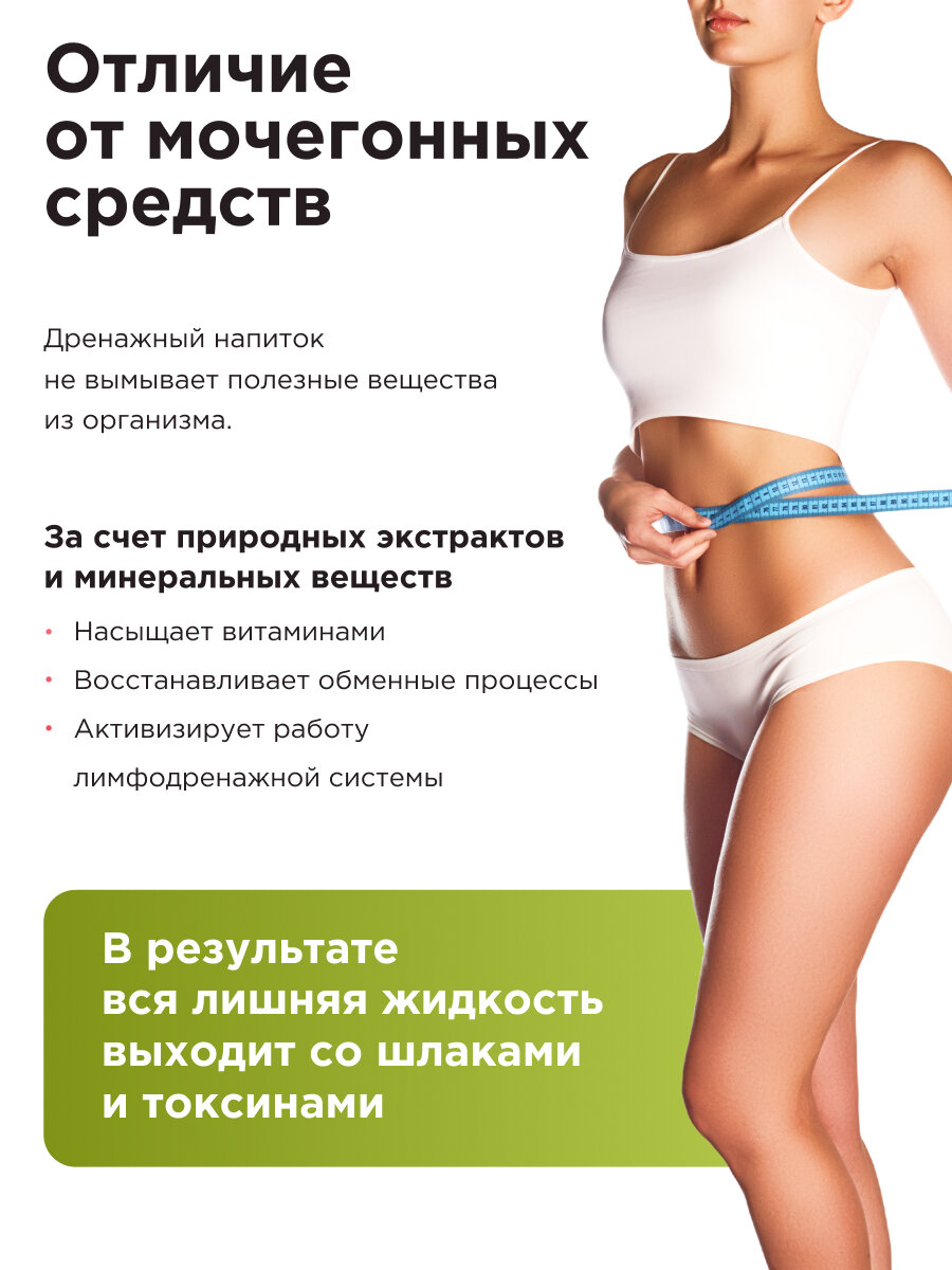 | Дополнительная информация | Для достижения эффективного результата, рекомендуется пропить курс, который составляет от 3-4 недель. В этот период важно поддерживать водный баланс и пить в среднем от 3-4 л воды в сутки. Как только вы восстановите нормальный питьевой режим, организм начнет выводить воду из подкожной жировой клетчатки. |