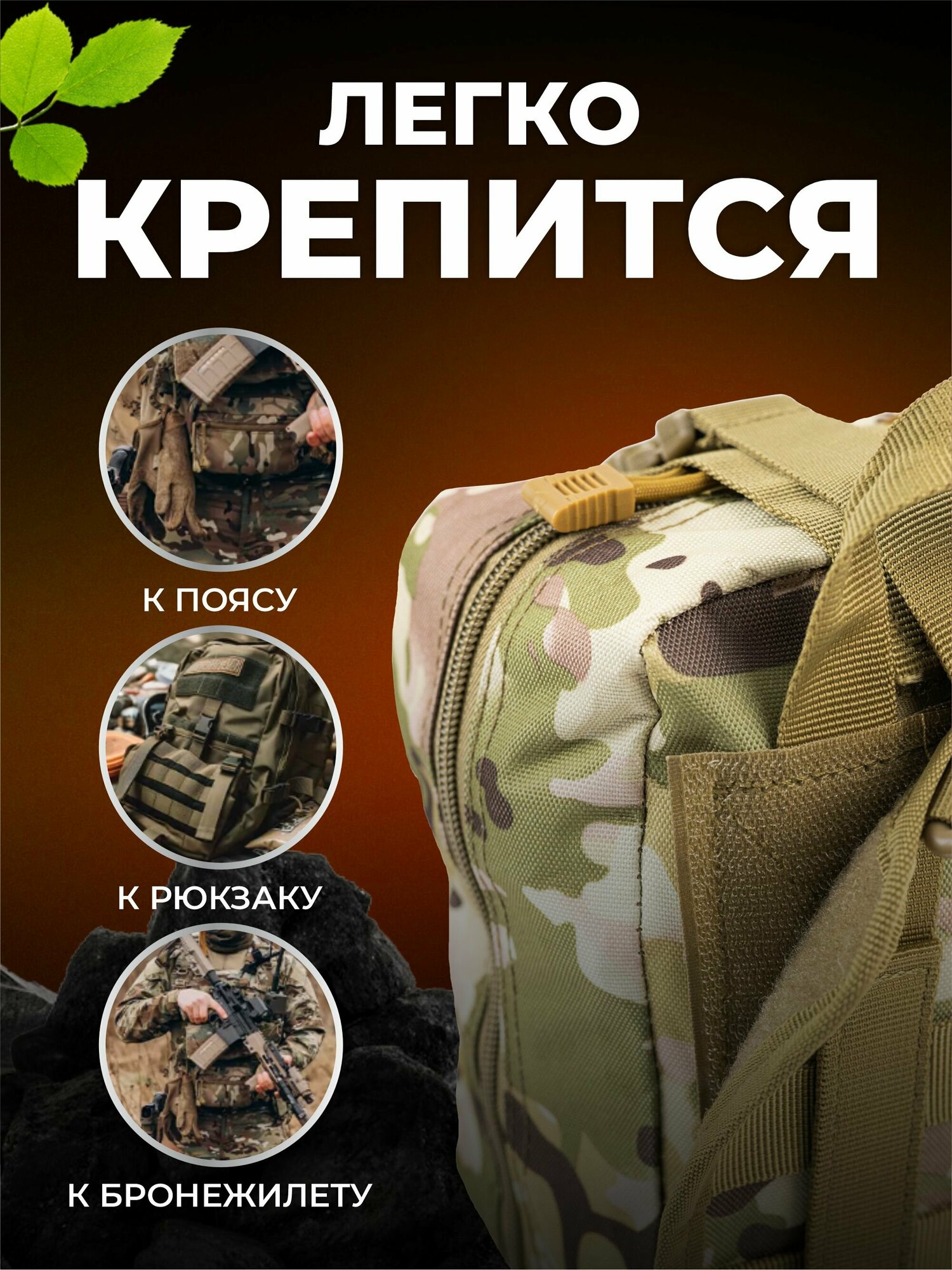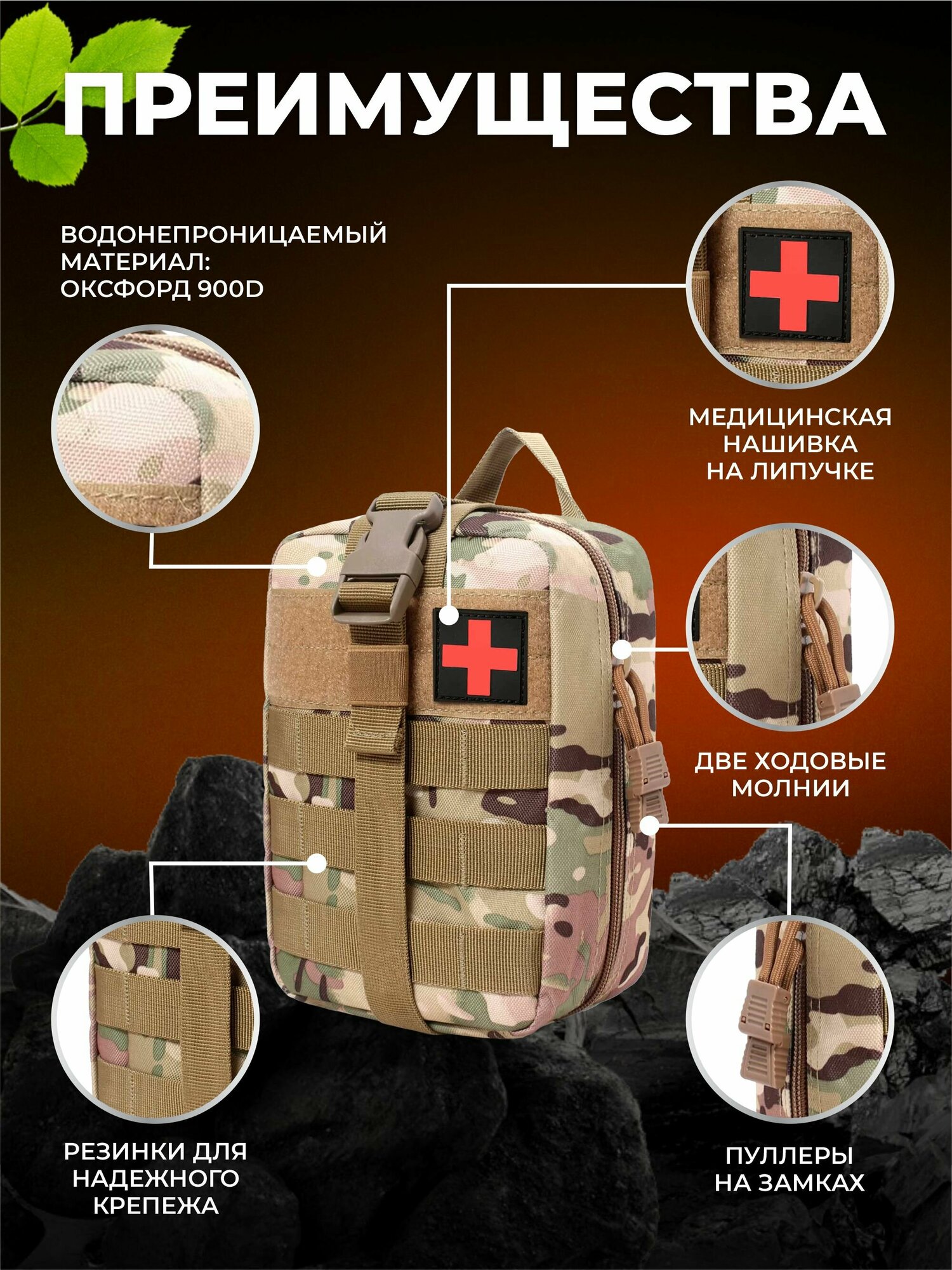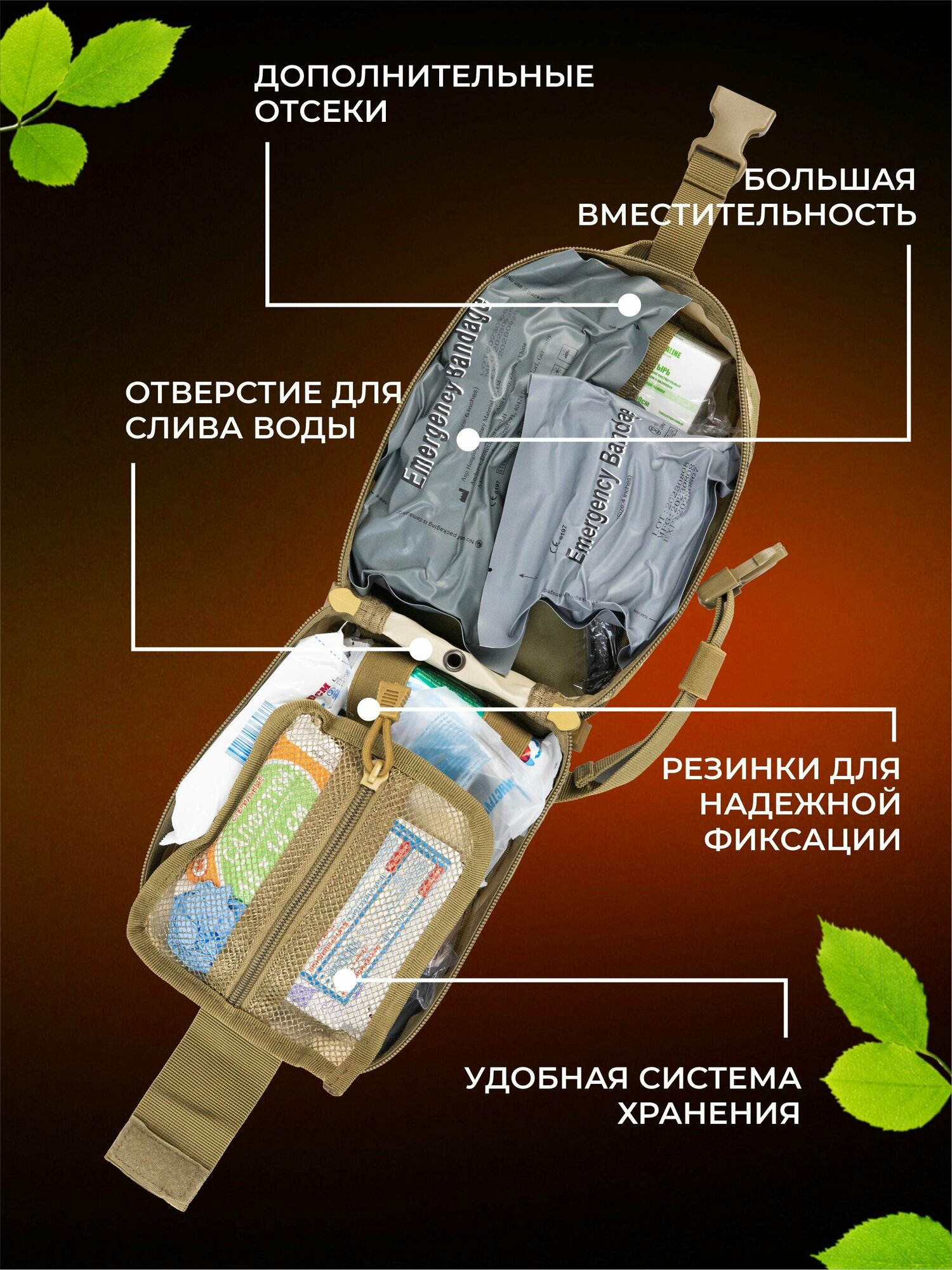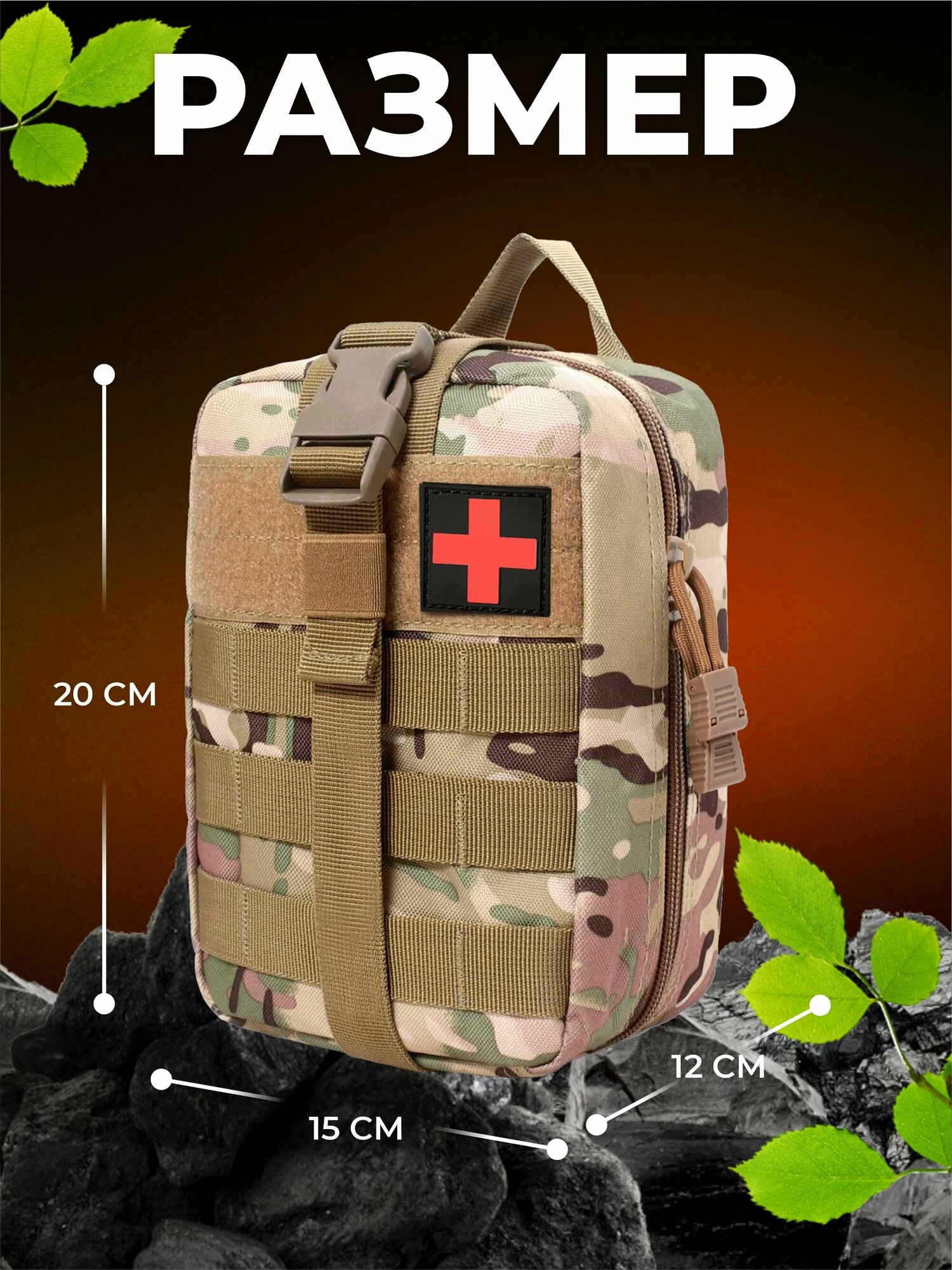 | Дополнительная информация | Система крепления MOLLE. Аптечка для оказания первой помощи при ранениях. Медицинская нашивка на липучке. Сумка под аптечку. Органайзер для хранения лекарств. Тактическая разгрузка военная. Сумка для аптечки в дорогу. |
