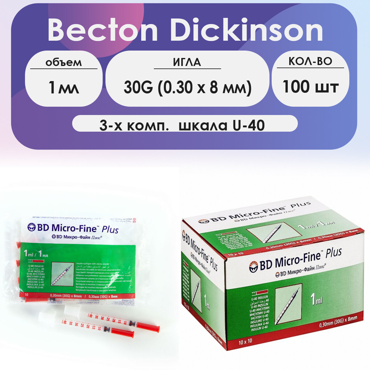 Шприц BD Micro-Fine Plus (3-комп.) 1мл шкала U40 игла 30G (0,30х8) - 100шт