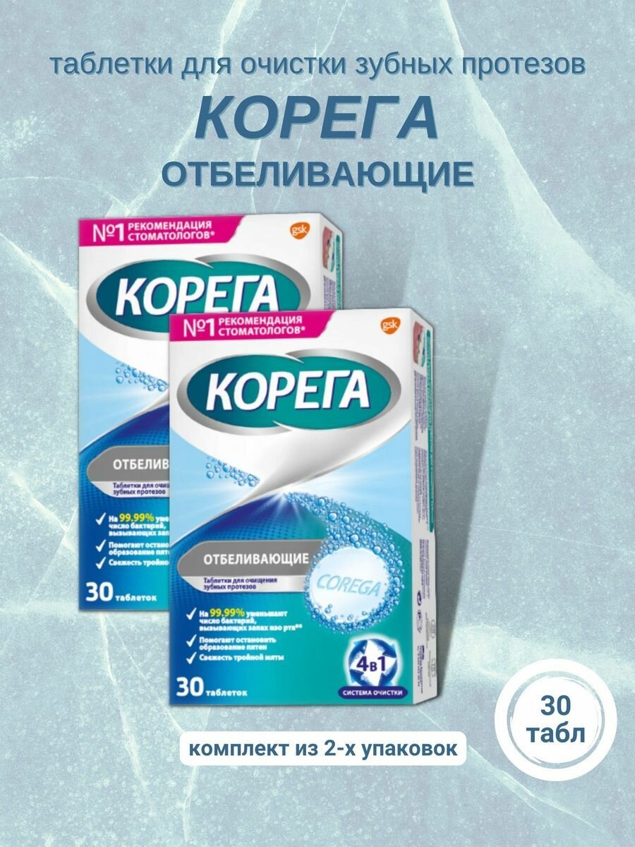 Корега Отбеливающие таблетки для тщательного очищения и восстановления естественной белизны зубных протезов, предотвращения образования пятен, 30шт*2