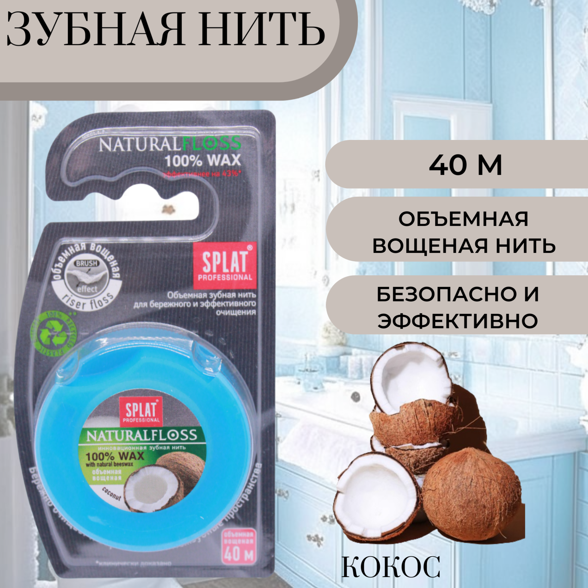 Зубная нить Splat Professional Dental Floss Natural Wax с ароматом кокоса, защита от кариеса, антибактериальная, объемная, 40 м