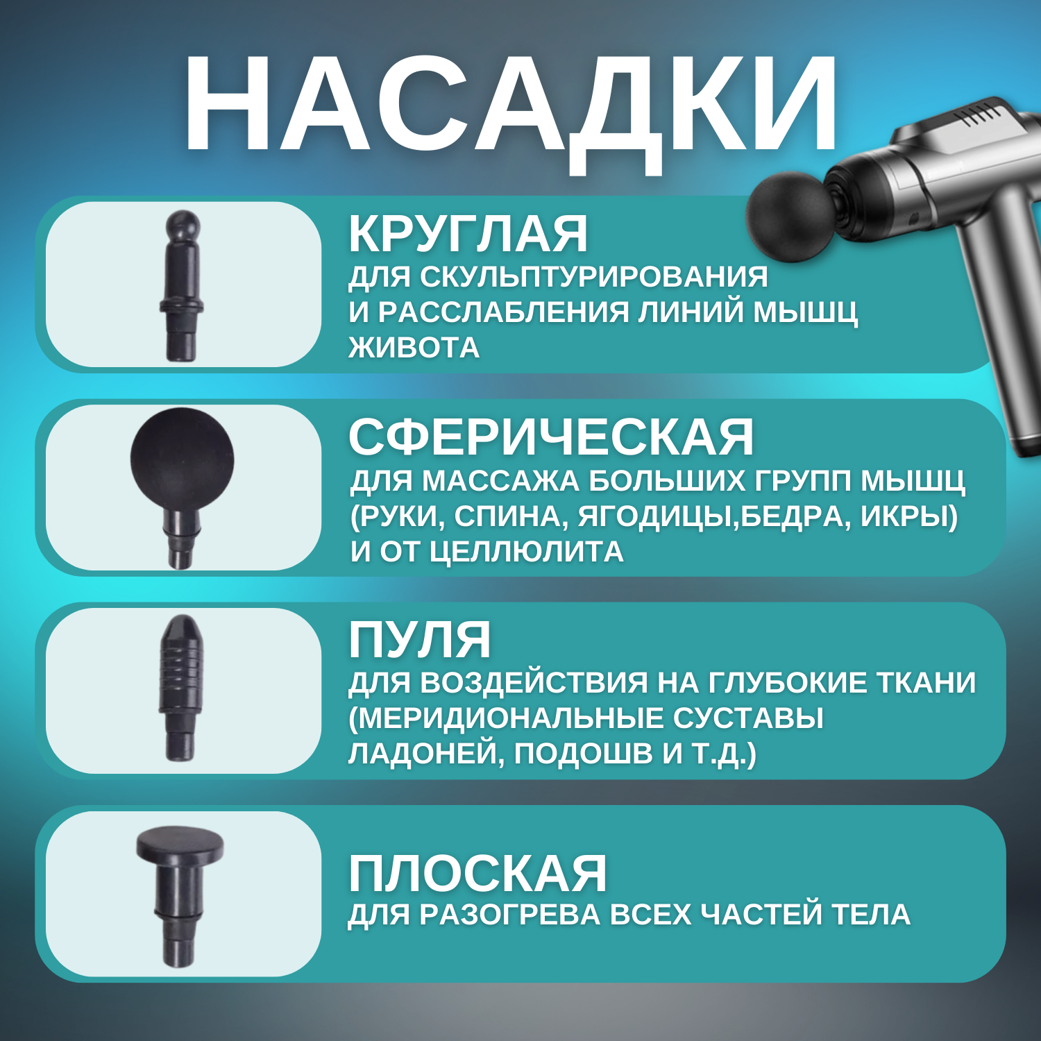 | Подробная комплектация | Перкуссионный массажёр; насадки для массежера – 8 шт; USB-кабель для зарядки – 1 шт; |