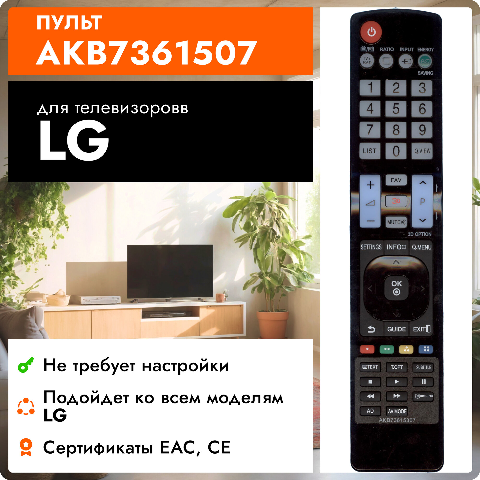 Пульт Huayu AKB73615307, для телевизоров LG без элементов питания. интересное: