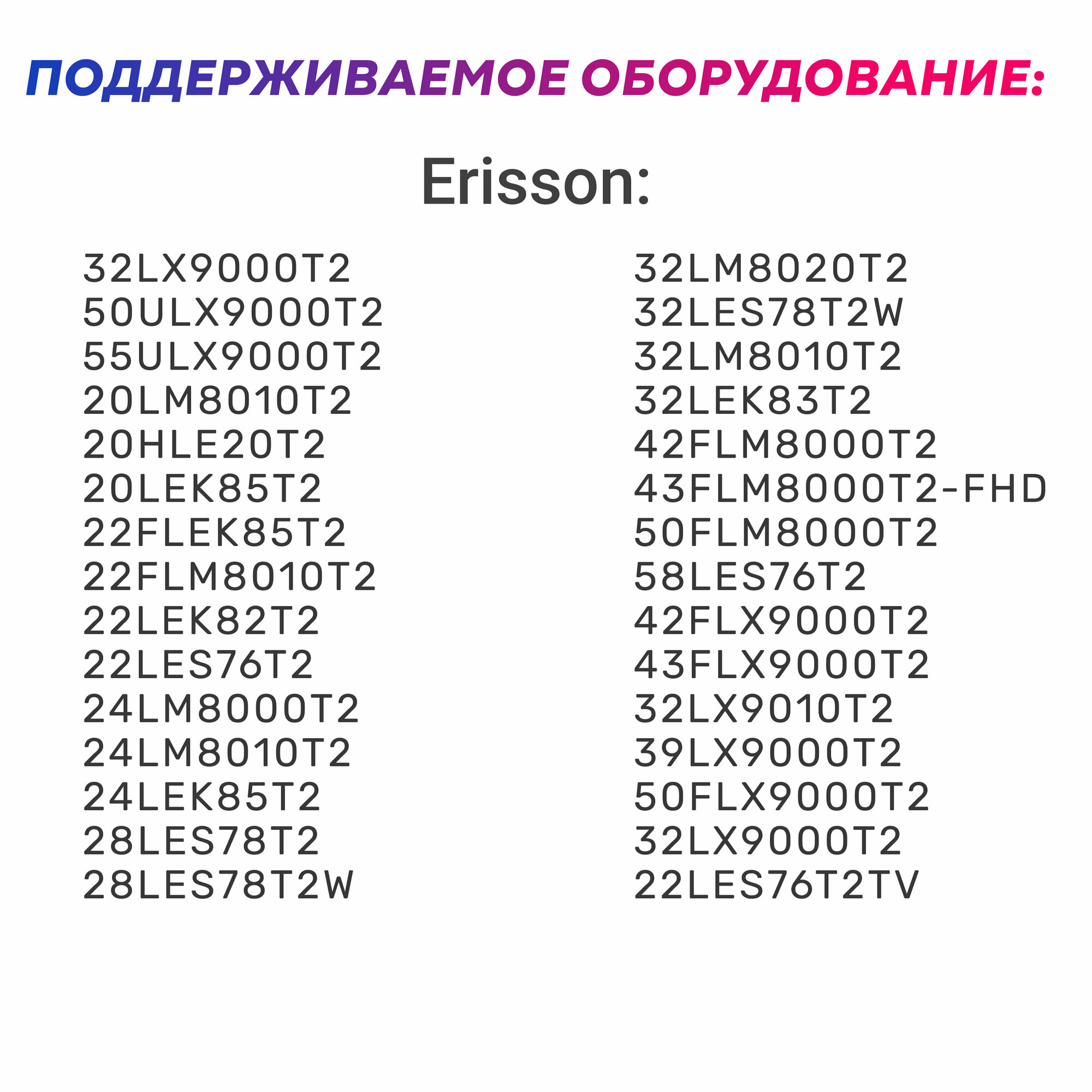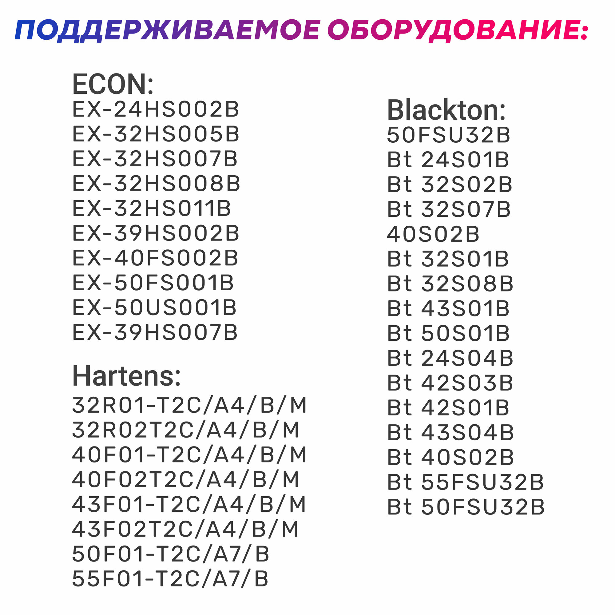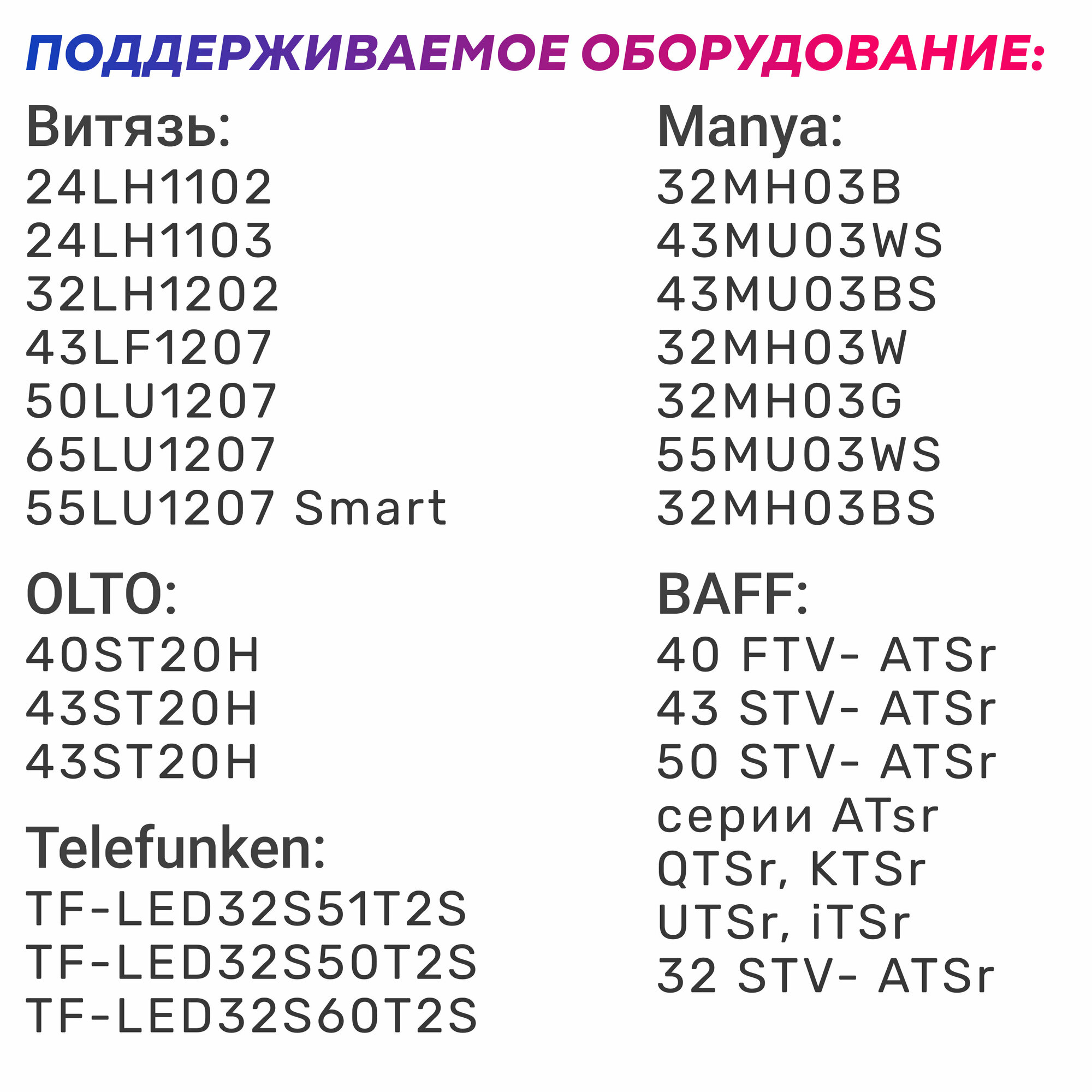 | Производитель совместимых устройств | Akai / BAFF / Bq / Blackton / ECON / Erisson / HARPER / HARTENS / HIBERG / Hi / MANYA / Olto / STRAUS / SUPRA / Skyline / Telefunken / Витязь |