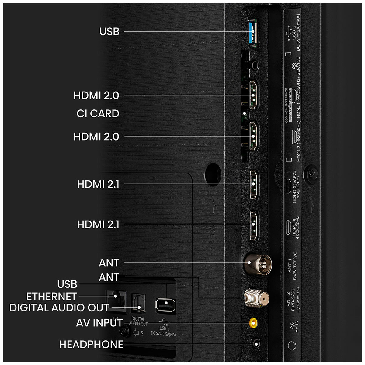 | Разъемы и интерфейсы | AV-вход / Ethernet - RJ-45 / SCART / USB Type-A / USB Type-A x 2 / вход HDMI / вход HDMI x 2 / вход HDMI x 3 / вход HDMI x 4 / вход VGA / вход аудио / выход аудио цифровой оптический / выход на наушники / композитный видеовход / компонентный видеовход / слот CI / слот CI x 2 / слот CI/CI+ |