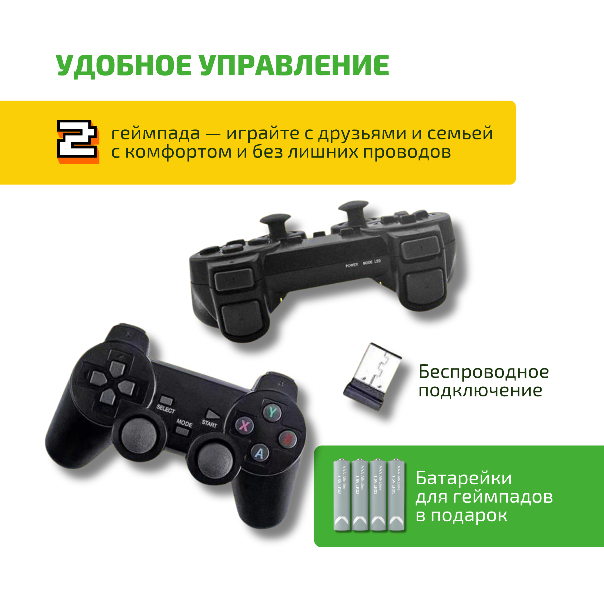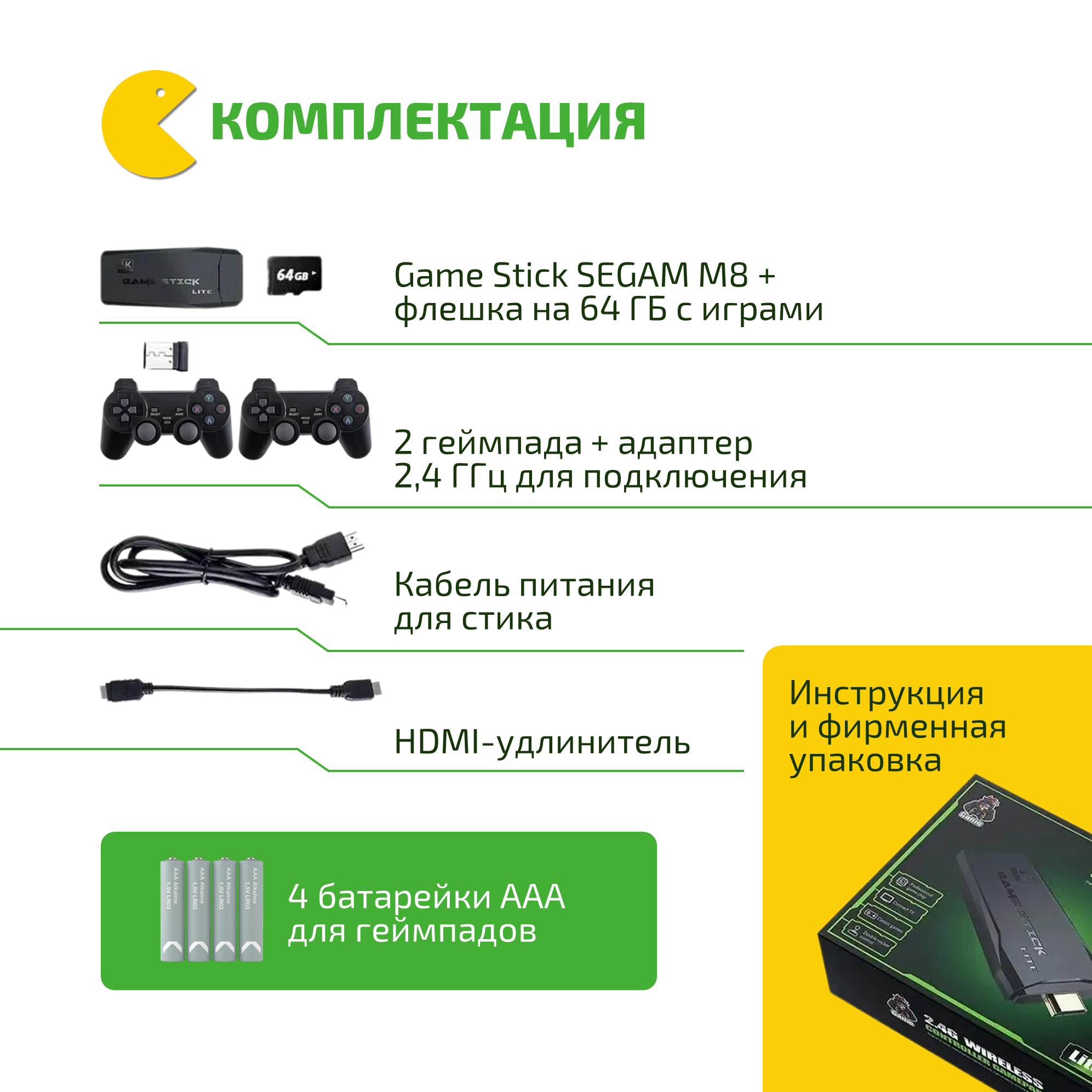 | Подробная комплектация | игровая приставка, адаптер для подключения геймпадов, 2 беспроводных геймпада, кабель питания с USB выходом, HDMI удлинитель, инструкция, 4 батарейки AAA |