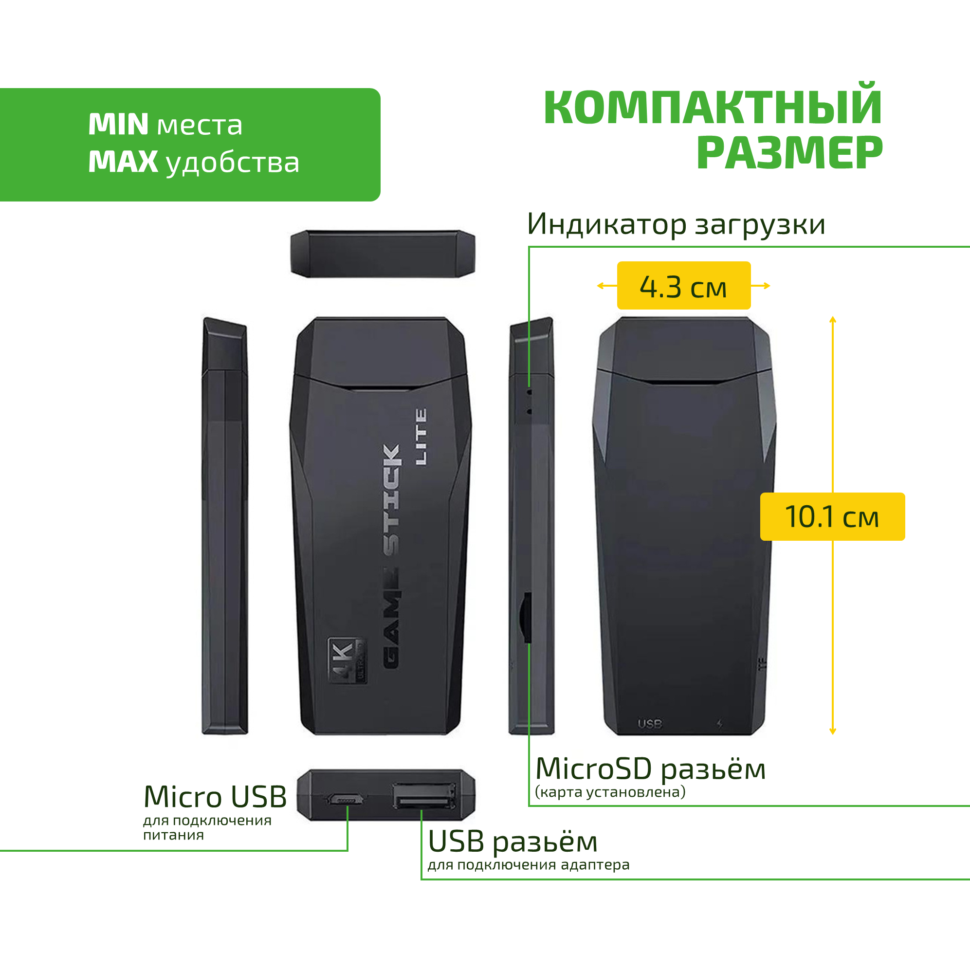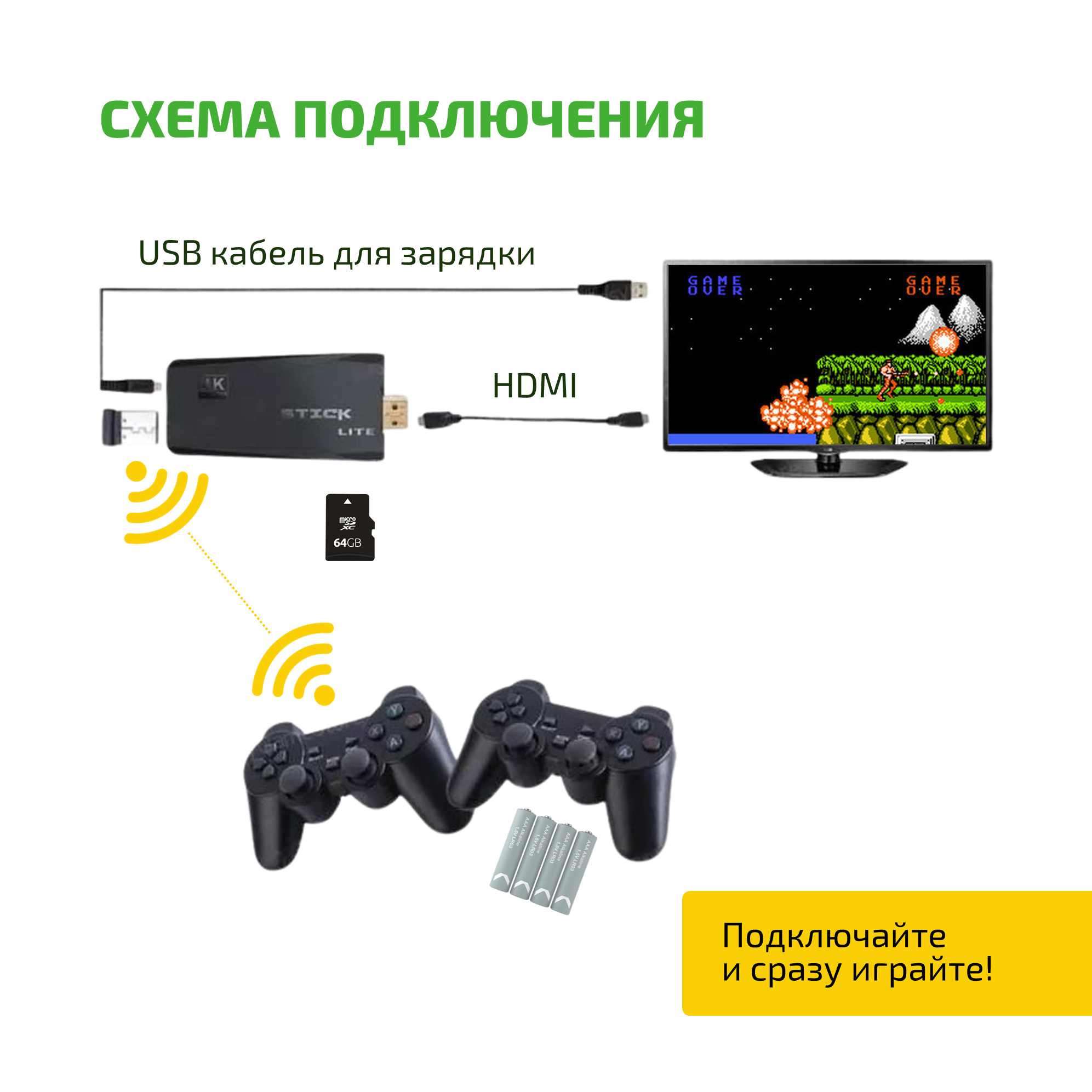 Игровая приставка Game Stick Lite M8 64 ГБ, 20 000+ ретро игр 90х и 2000-х, 9 эмуляторов Денди, Сега и др, 2 беспроводных геймпада с батарейками, подарок геймеру