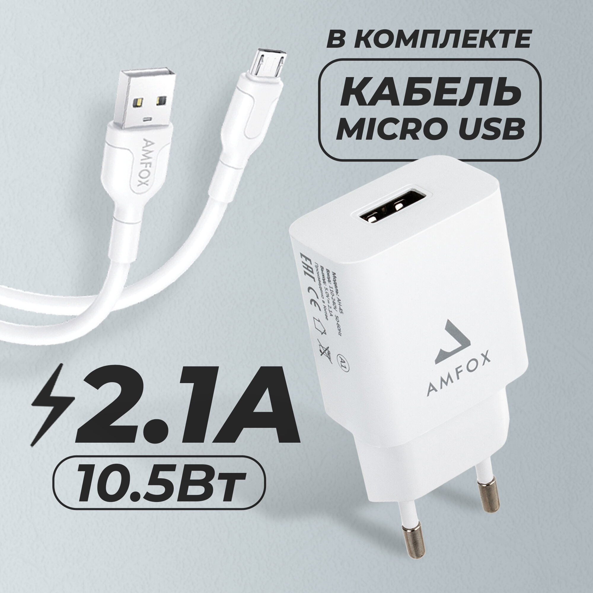 Купить Зарядное устройство для телефона, AMFOX, AH-45, 2.1A 10,5 Вт, кабель Micro USB, блок питания, как commo зарядка микро, адаптер на андроид, белое