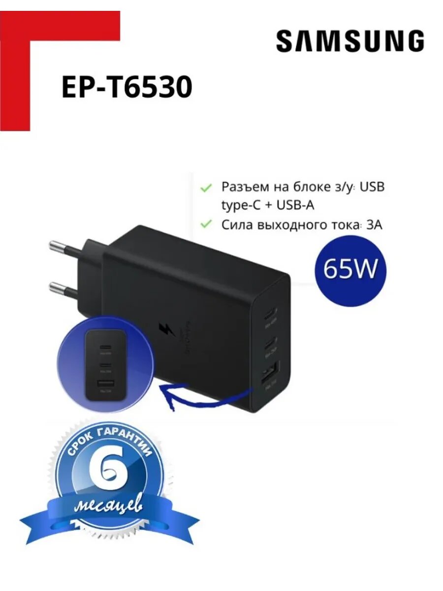 Сетевое зарядное устройство Samsung EP-T6530NBEGEU EP-T6530 65W 3-Port USB-Cx2/USB Black