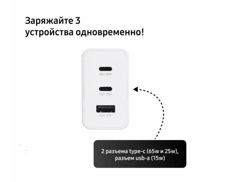 | Дополнительная информация | совместимые устройства: устройства с USB Type-C, устройства Apple iPhone (при наличии совместимого кабеля); при зарядке устройств с высоким энергопотреблением (ноутбуки и пр.) рекомендуется подключать их к соответствующему разъему 65W на адаптере питания без подключенных дополнительных устройств; вес 155 г; выходное напряжение (максимум, обычная зарядка) 5 В; выходное напряжение (максимум, быстрая зарядка) (USB-C1, PDO) 5 В, 9 В, 15 В, 20 В / (USB-C1, PPS) 5.0-20.0 В / (USB-C2, PDO) 5 В, 9 В / (USB-C2, PPS) 5.0-11.0 В / (USB-A) 5В, 9 В; выходная сила тока (максимум, быстрая зарядка) (USB-C1, PDO) 3 A (5 В), 3 A (9 В), 3 A (15 В), 3.25 A (20 В) / (USB-C1, PPS) 3.5 А (5.0-11.0 В), 2.8 A (5.0-16.0 В), 2.25 A (5.0-20.0 В) / (USB-C2, PDO) 3 A (5 В), 2.77 A (9 В) / (USB-C2, PPS) 3.0 A (5.0-5.9 В), 2.25 A (5.0-11.0 В) / (USB-A) 2.0 A (5 В), 1.67 A (9 В); выходная сила тока (максимум, обычная зарядка) 3 A |