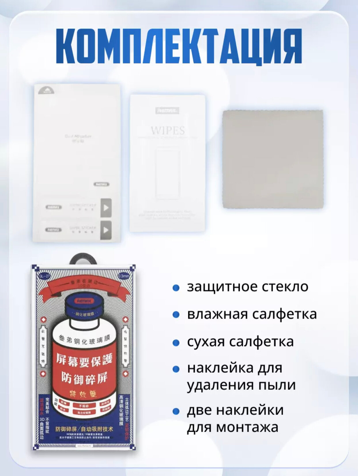 | Подробная комплектация | Защитное стекло Remax, стикеры для удаления пыли, салфетки. |