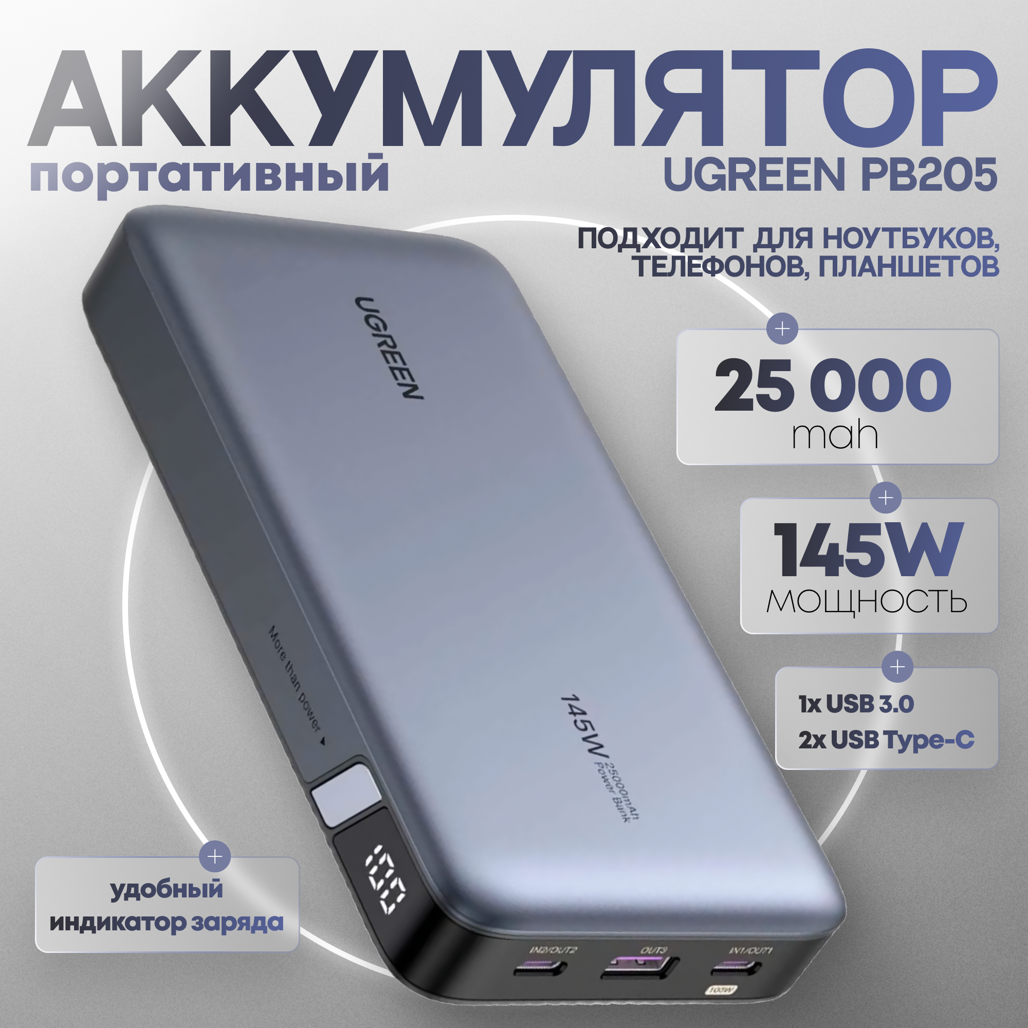 СохранитьПортативный аккумулятор Ugreen PB205, 25000мАч, 3 выходных разъема, 145Вт интересное:
