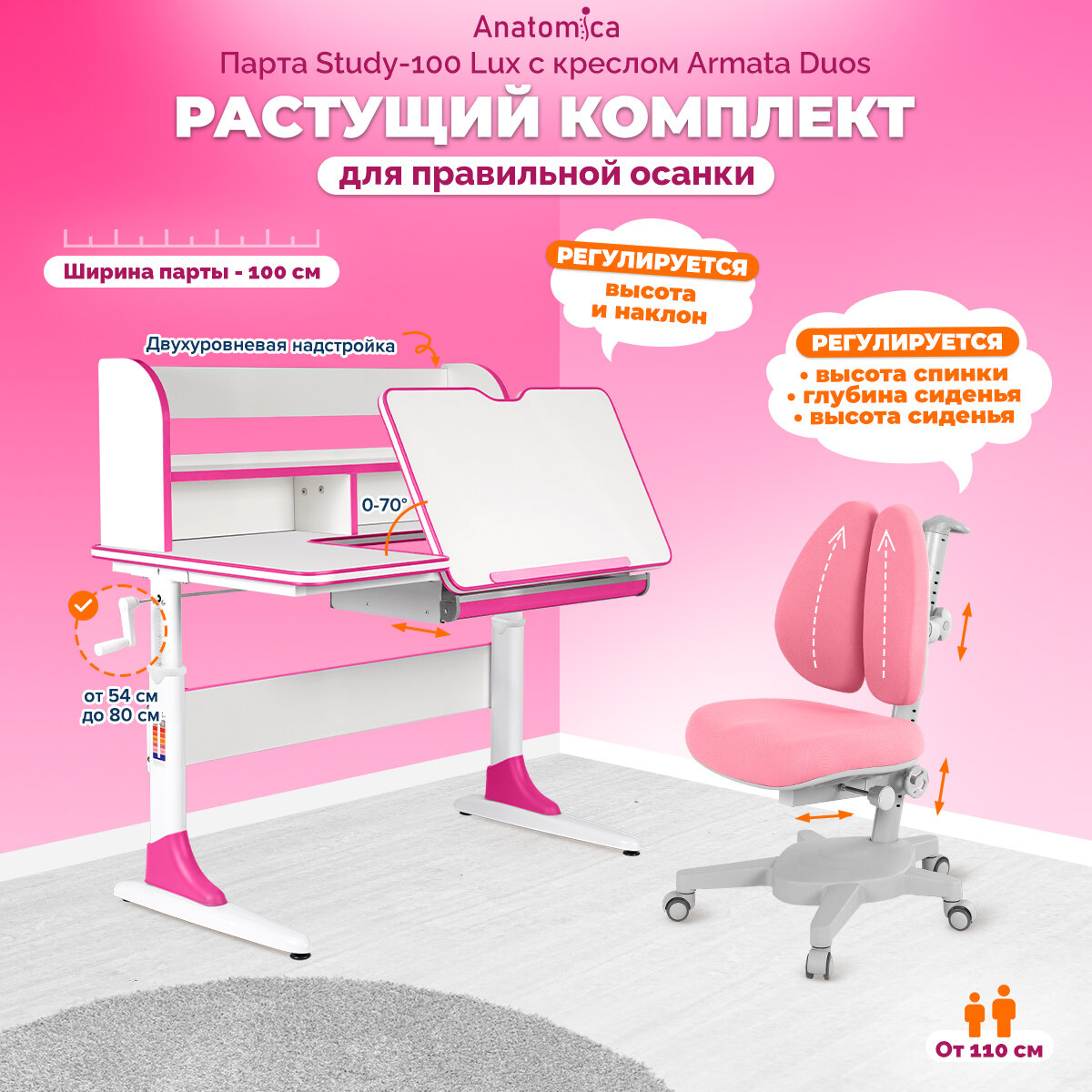 Купить Комплект Anatomica парта + кресло, цвет белый/розовый с розовым креслом