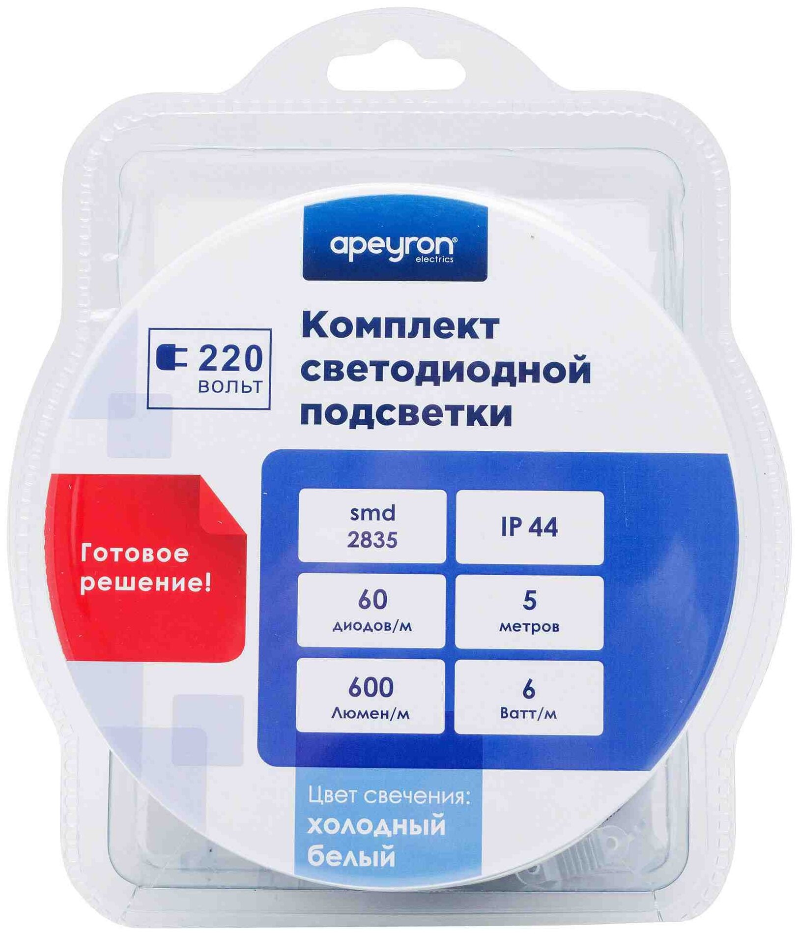 Светодиодная лента 220 вольт Apeyron Electrics, 5 м, светодиодов: 300 шт., 30 Вт, холодный белый, в комплекте блок питания!