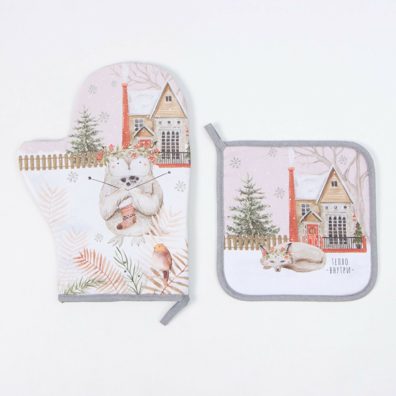 Новый год. Набор кухонный Этель "Звери в городе": прихватка 19х19 см, варежка-прихватка 20х28 см, 100% хл