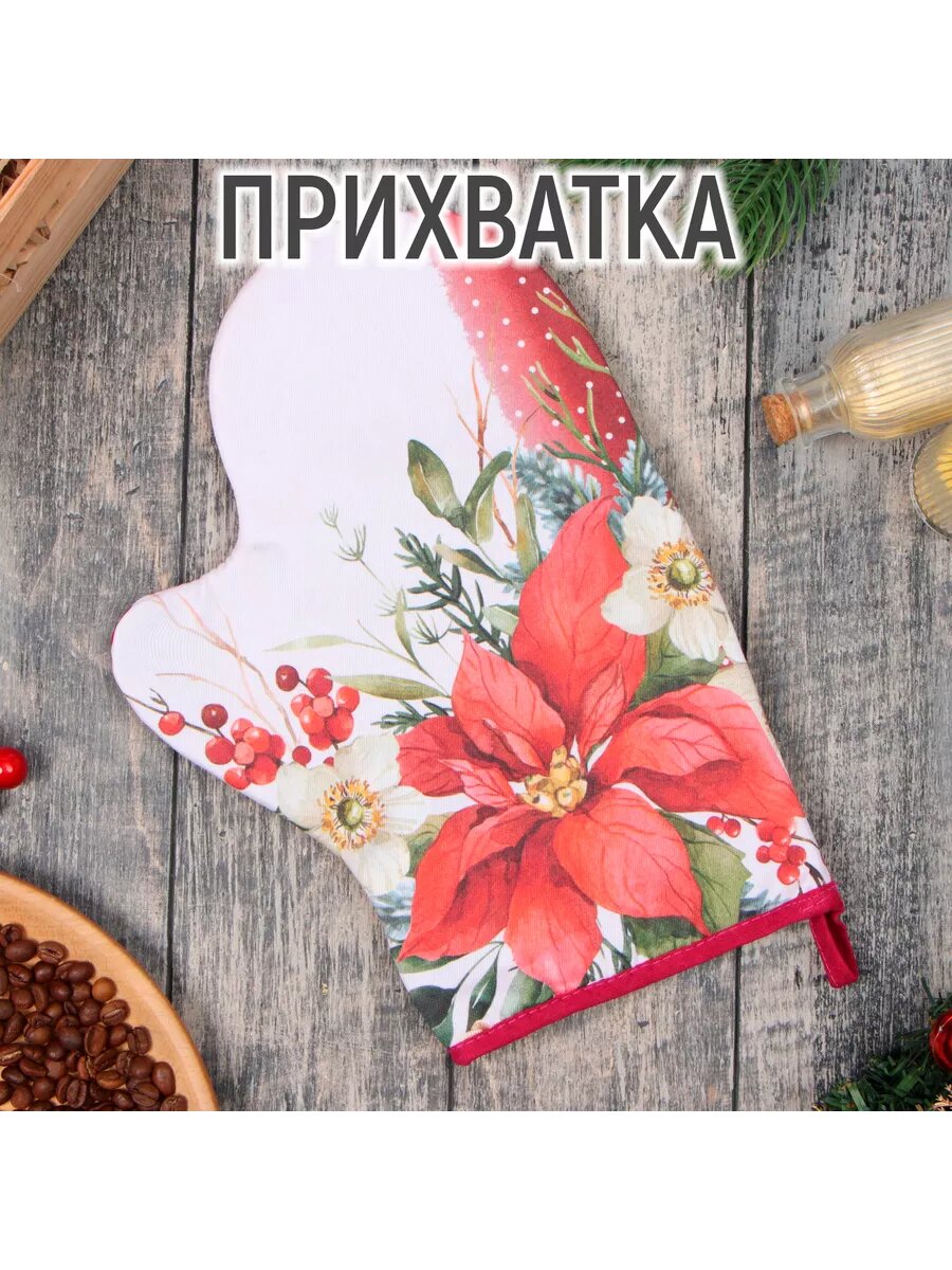 Новый год. Набор кухонный Этель "Пуансеттия": прихватка 19х19 см, варежка-прихватка 20х28 см, 100% хл