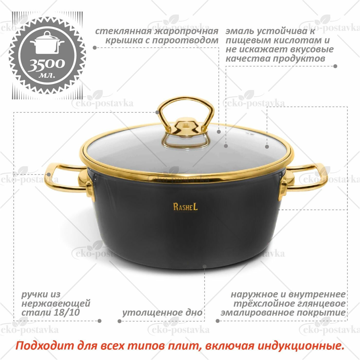 Кастрюля эмалированная 3,5 л с крышкой 22 см Rashel для газовых, электрических и индукционных плит, эмаль, посуда для индукции эмалированная сталь