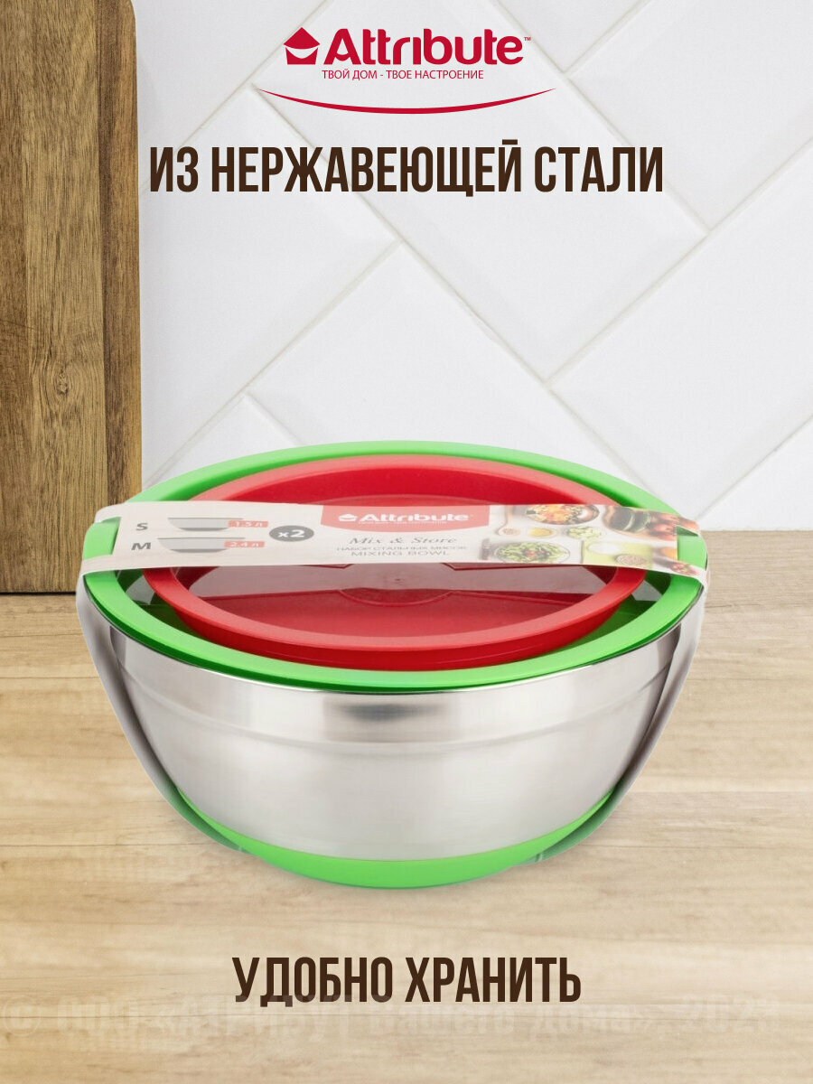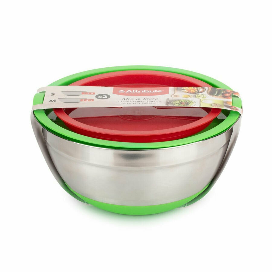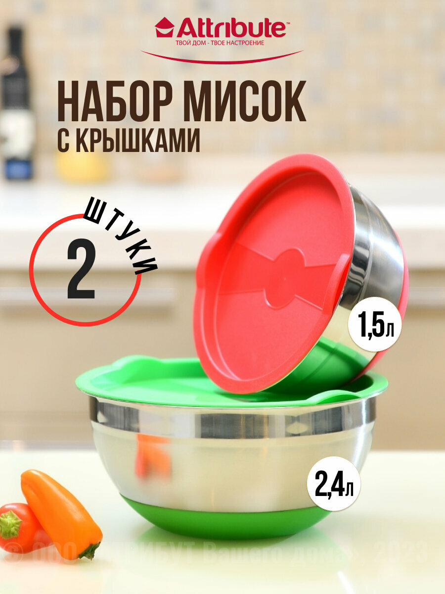 Набор мисок ATTRIBUTE ASS022 MIXSTORE с крышками, 2 штуки, 1.5л+2.4л, серебристый
