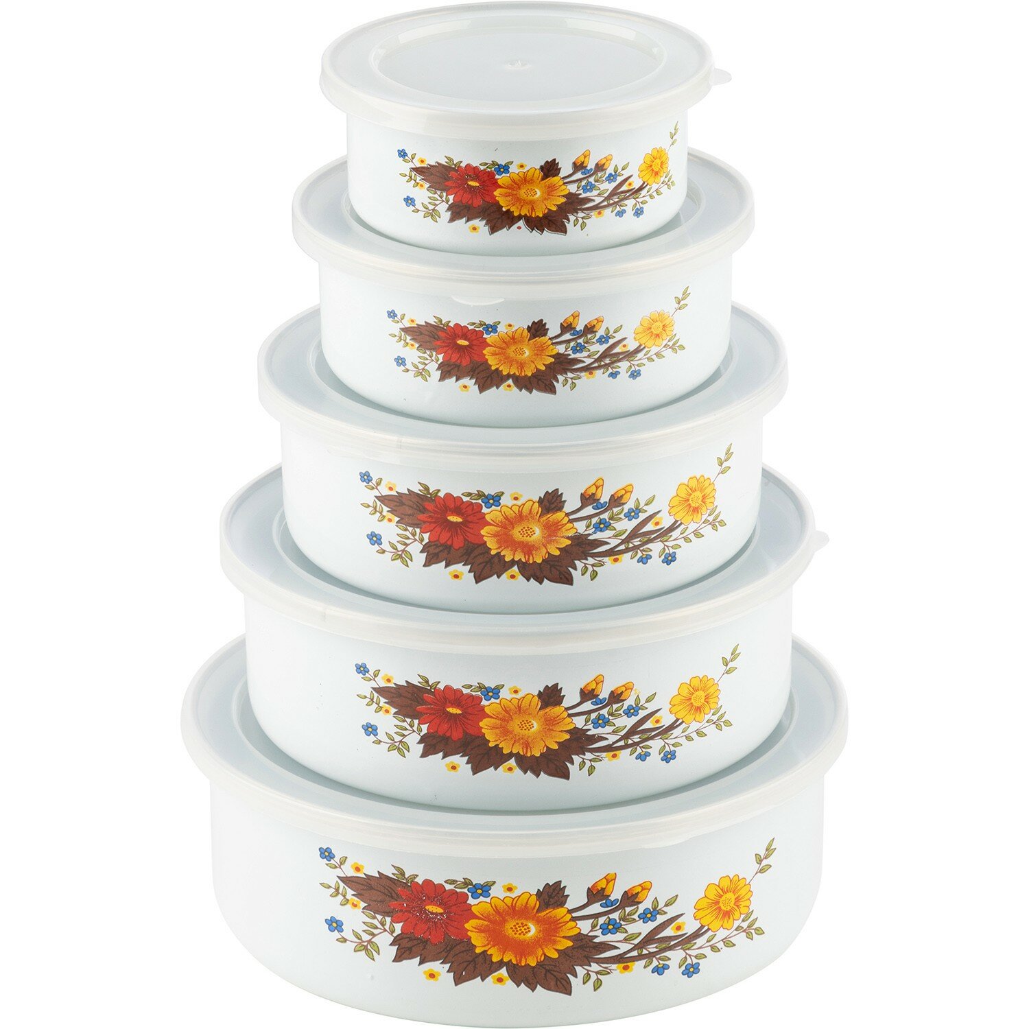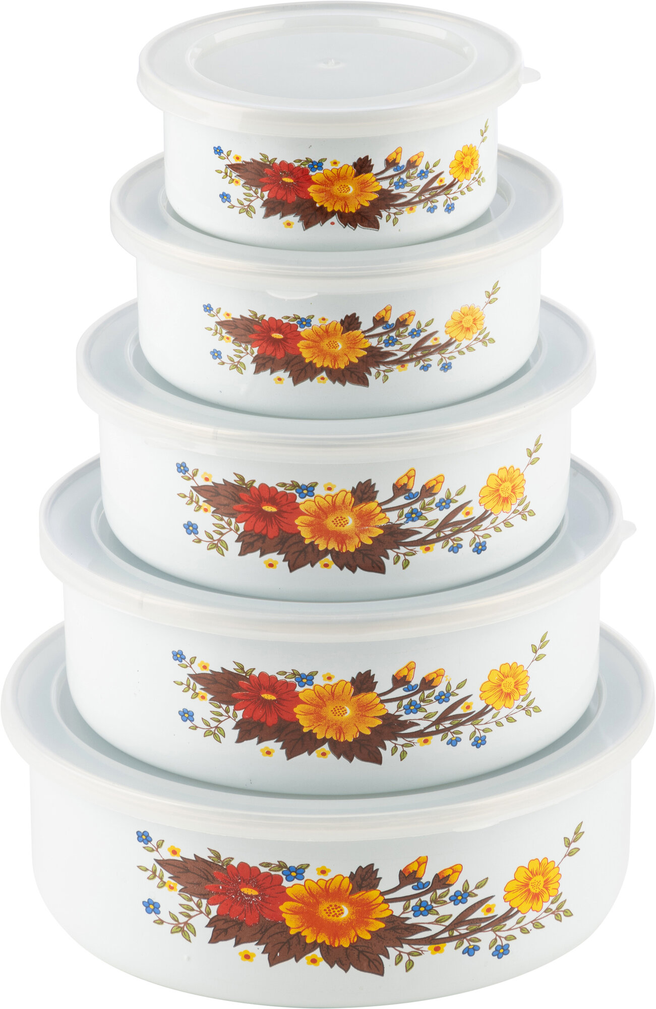 Набор из 5 эмалированных мисок с крышками, FAMILIA, 195/340/600/850/1250 мл, цвет: белый с дизайном