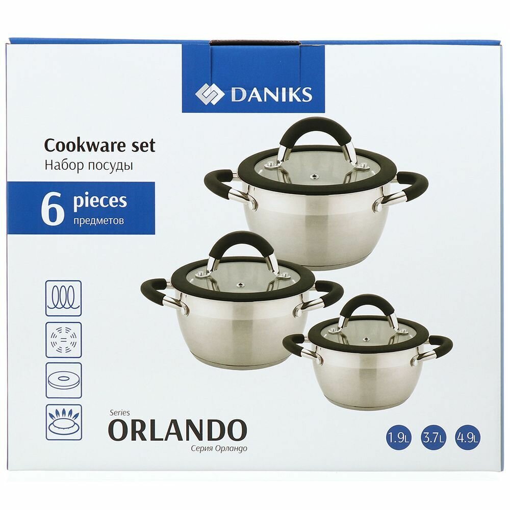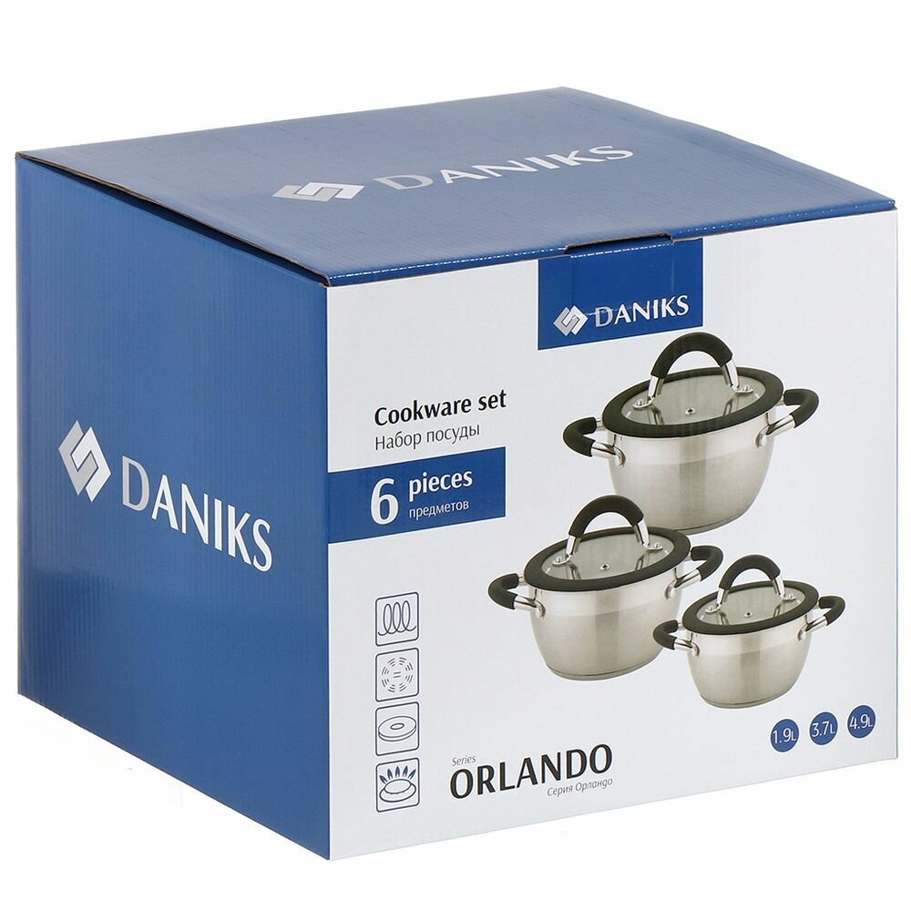 Купить Набор посуды нержавеющая сталь, 6 предметов, кастрюли 1.9, 3.7, 4.9 л, индукция, Daniks, Орландо, GS-01435-6SE