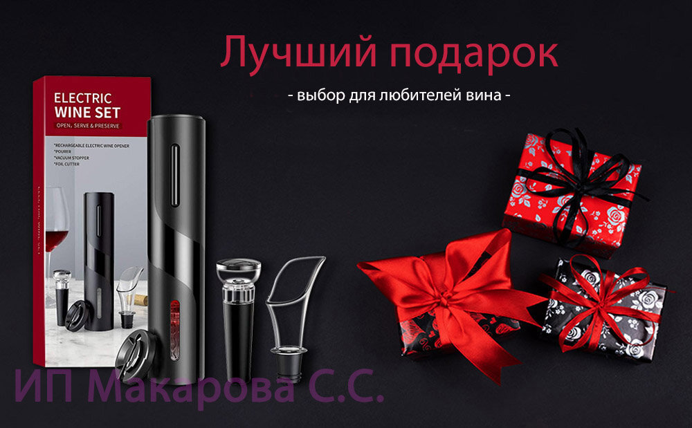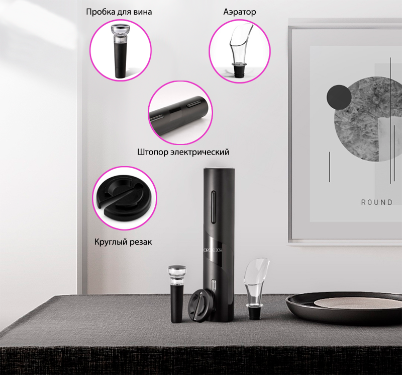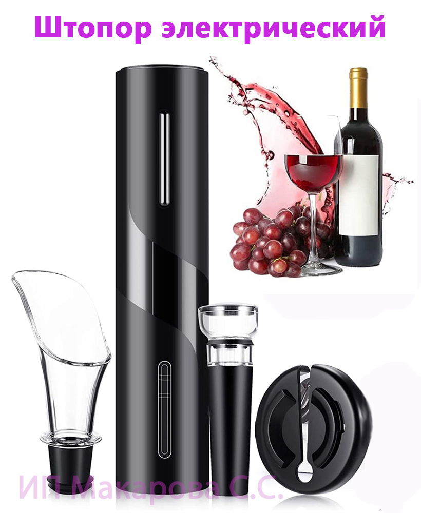 | Комплектация | Электрический штопор, Пробка вакуумная, Нож резак для снятия фольги, аэратор для бутылки вина, Батарейки |