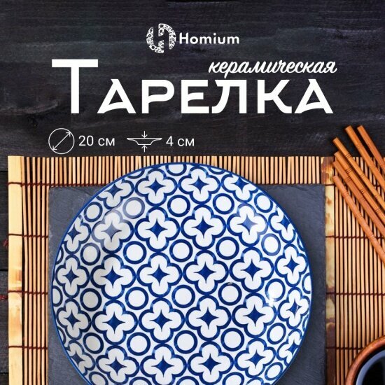 Керамическая тарелка Homium, Japanese Collection в японском стиле, обеденная тарелка с рисунком, голубой, D20см, набор 2шт.