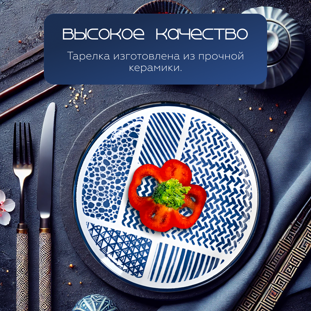 Тарелка обеденная керамическая для сервировки стола Homium, Japanese Collection, Очарование, цвет белый/синий, D20см