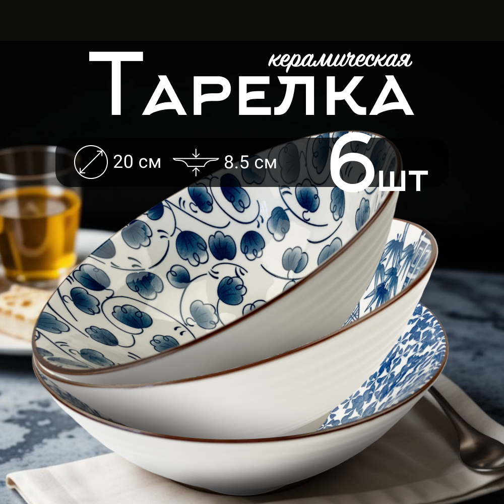 Набор тарелок Homium Japanese Collection "Очарование" 20 см, глубокие, 6 шт, белый/синий (371594-6p-23-25-29)