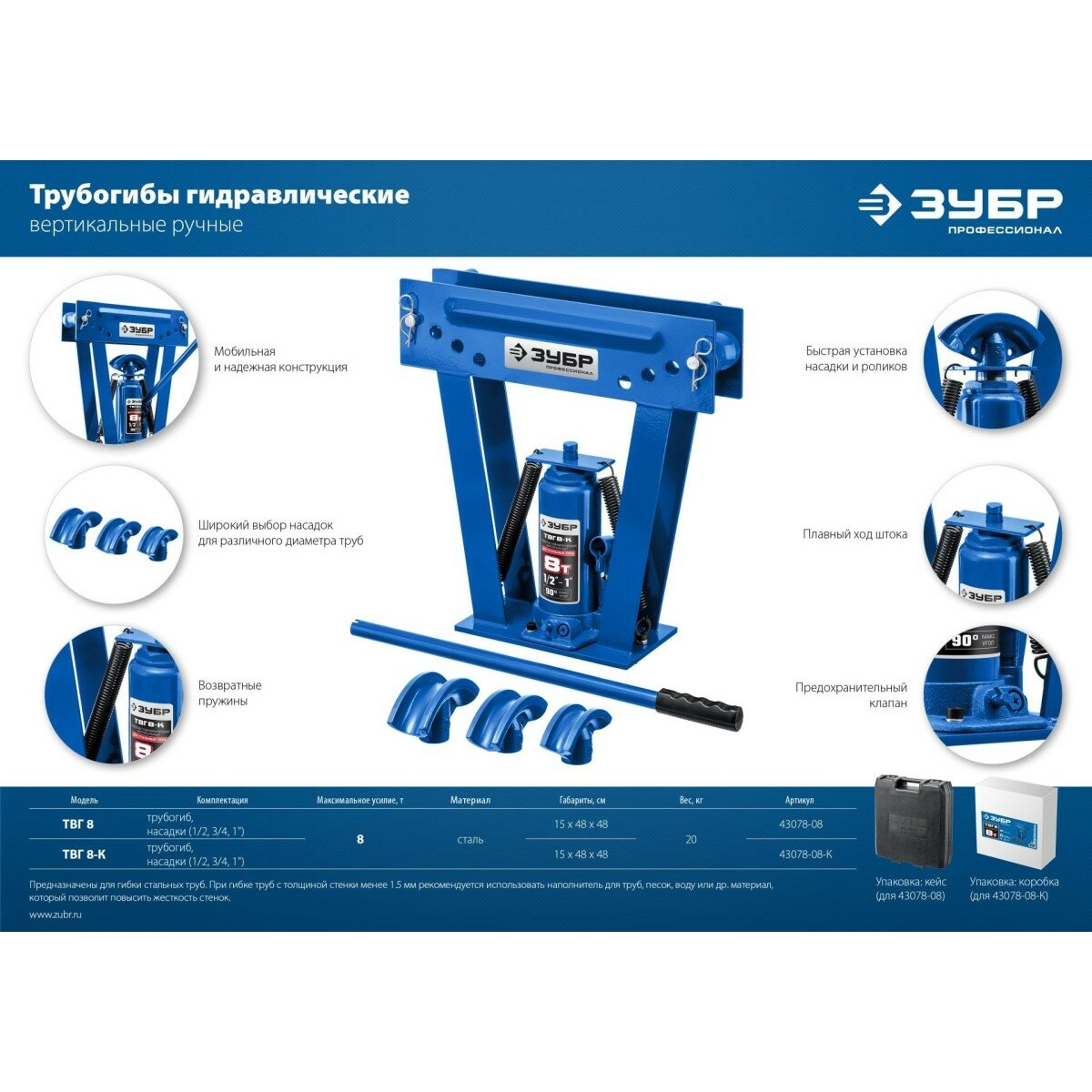 ЗУБР 8 т, трубогиб гидравлический с ручным приводом вертикальный ТВГ-8 43078-08_z01 Профессионал