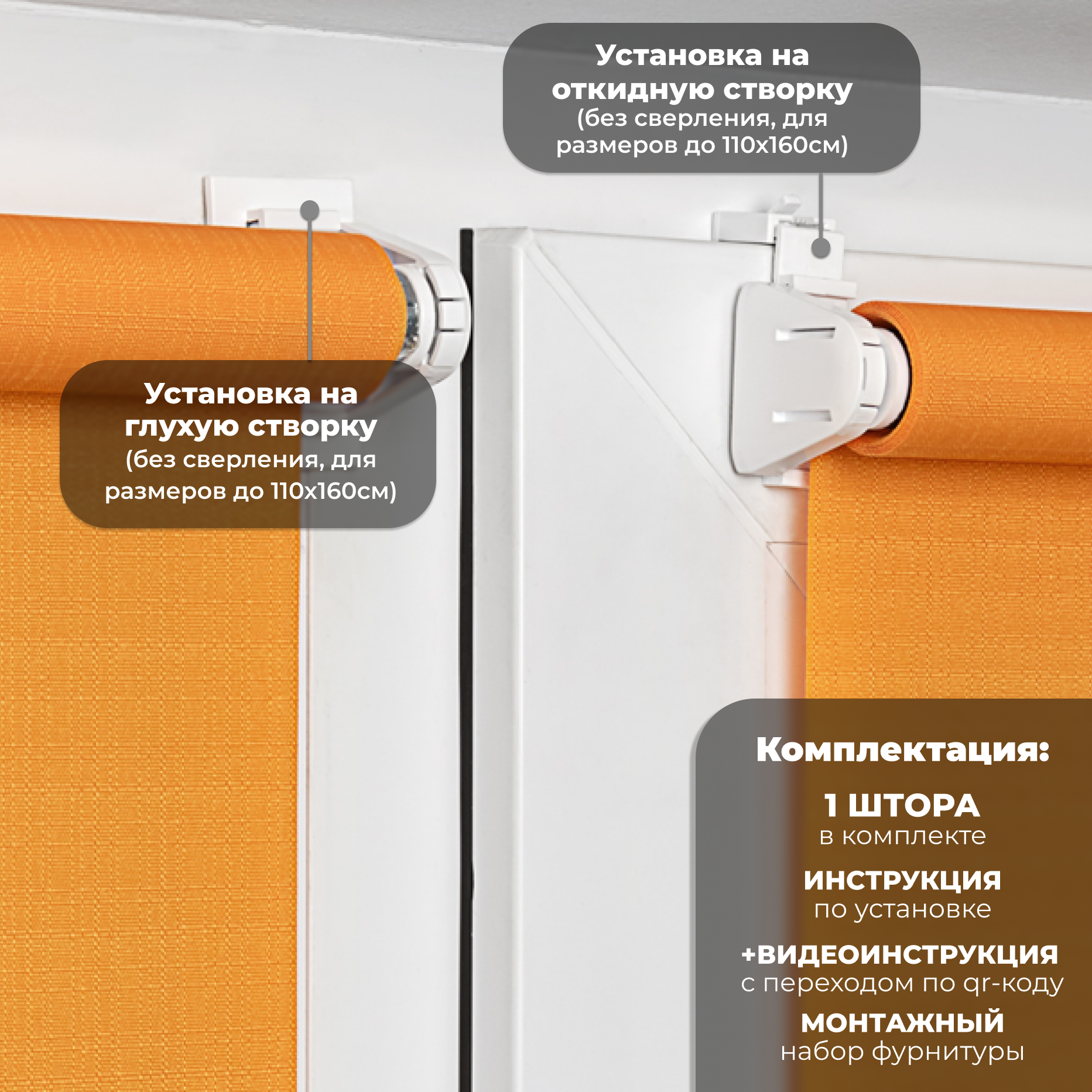 | Комплектация | Рулонная штора на стальном оцинкованном валу 17 мм - 1 шт, утяжелитель пластиковый вшитый - 1шт, боковые кронштейны - 2шт, регулировочные кронштейны на откидную створку - 2 шт, площадки на двустороннем скотче для глухой и откидной створки окна - 2 шт, механизм управления на цепи 1 шт, ограничитель управления цепи - 1 шт, этикетка и инструкция - 1 шт. |