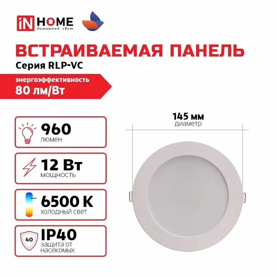 IN HOME Светильник потолочный RLP-VC круглый, 12 Вт, 6500 К, встраиваемый, 960 Лм, 145мм, IP40 интересное: