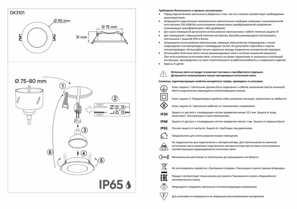 СохранитьСветильник потолочный встраиваемый,влагозащищённый DENKIRS DK3101-WH,IP 65, круглый, белый, GU5,3, пластик интересное: