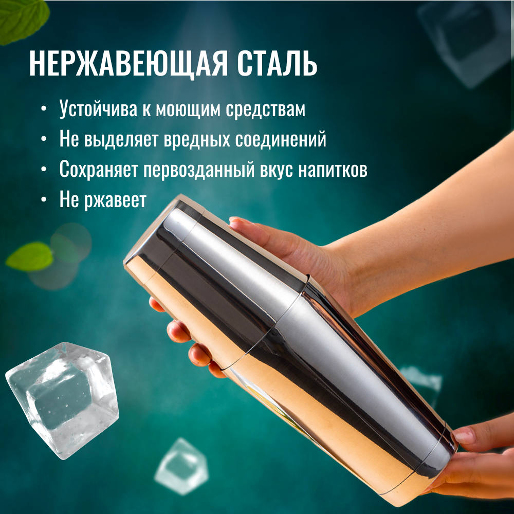 | Подробная комплектация | Шейкер бармена с отверстиями для фильтрации; Коктейльная ложка; Открывашка; Стрейнер; Мадлер; Щипцы. Мерный стакан |