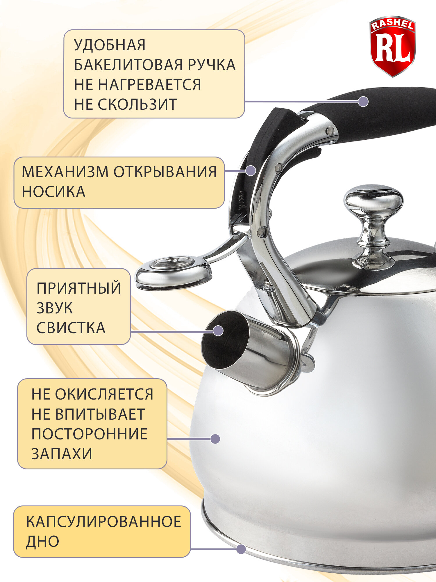 Чайник нержавеющая сталь, 3 л, со свистком, зеркальный, ручка бакелитовая, RasheL, индукция, кремовый, М-7830
